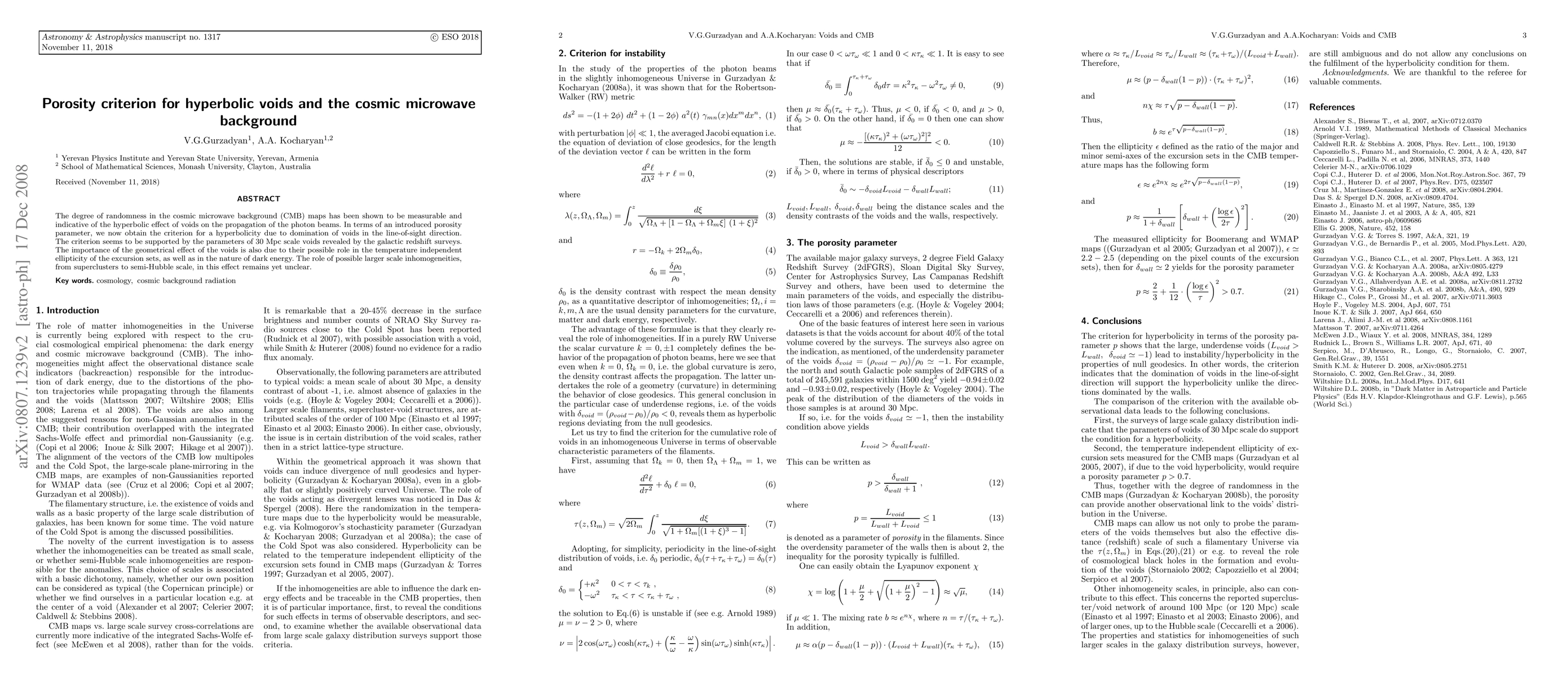 The introduction of a porosity parameter to quantify the effect of voids on CMB properties and establish a criterion for hyperbolicity.