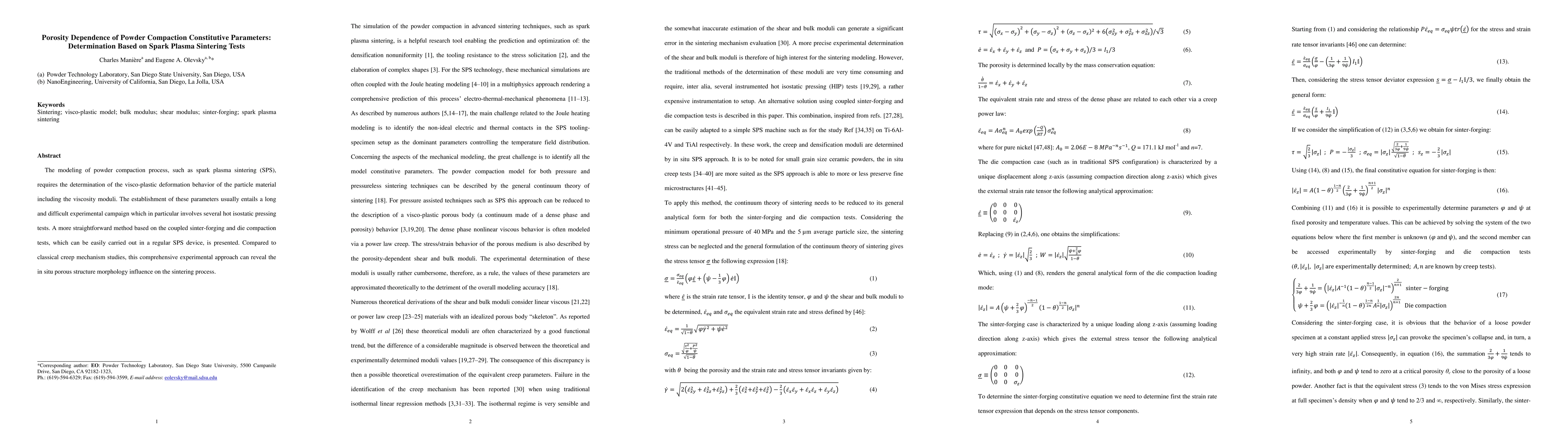 This paper presents a simplified method for determining powder compaction constitutive parameters using spark plasma sintering tests, revealing the in situ influence of porosity on the sintering process. This approach replaces lengthy hot isostatic pressing tests, offering a more straightforward evaluation of visco-plastic deformation behavior.