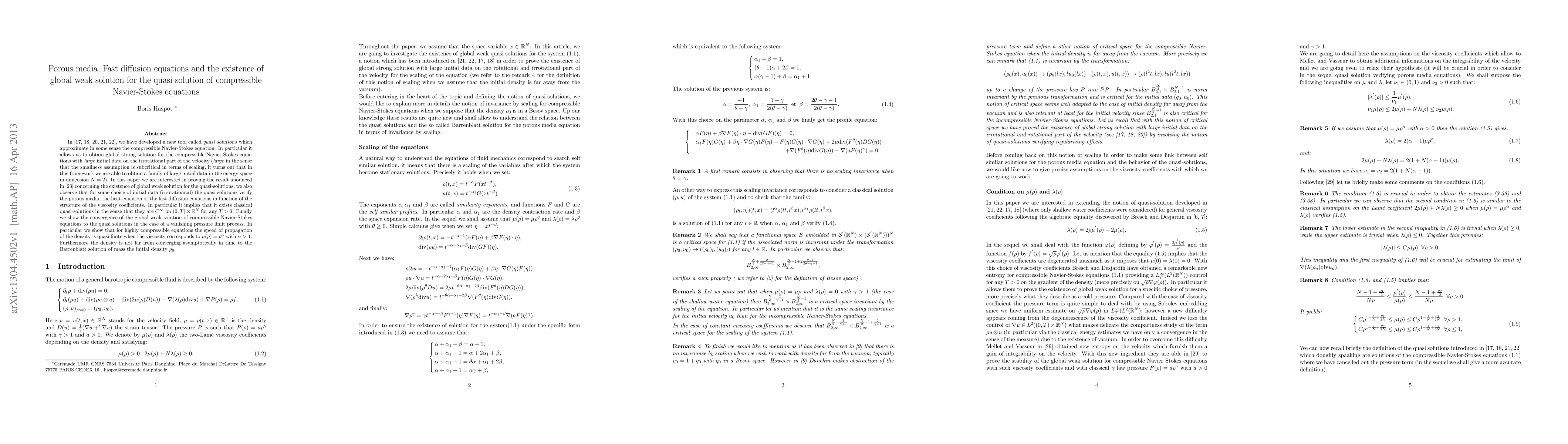 In \cite{arxiv,arxiv1,Kor,cras1,cras2}, we have developed a new tool called \textit{quasi solutions} which approximate in some sense the compressible Navier-Stokes equation. In particular it allows us to obtain global strong solution for the compressible Navier-Stokes equations with \textit{large} initial data on the irrotational part of the velocity (\textit{large} in the sense that the smallness assumption is subcritical in terms of scaling, it turns out that in this framework we are able to obtain a family of large initial data in the energy space in dimension N=2). In this paper we are interested in proving the result anounced in \cite{cras3} concerning the existence of global weak solution for the quasi-solutions, we also observe that for some choice of initial data (irrotationnal) the quasi solutions verify the porous media, the heat equation or the fast diffusion equations in function of the structure of the viscosity coefficients. In particular it implies that it exists classical quasi-solutions in the sense that they are $C^{\infty}$ on $(0,T)\times\R^{N}$ for any $T>0$. Finally we show the convergence of the global weak solution of compressible Navier-Stokes equations to the quasi solutions in the case of a vanishing pressure limit process. In particular we show that for highly compressible equations the speed of propagation of the density is quasi finite when the viscosity corresponds to $\mu(\rho)=\rho^{\alpha}$ with $\alpha>1$. Furthermore the density is not far from converging asymptotically in time to the Barrenblatt solution of mass the initial density $\rho_{0}$.