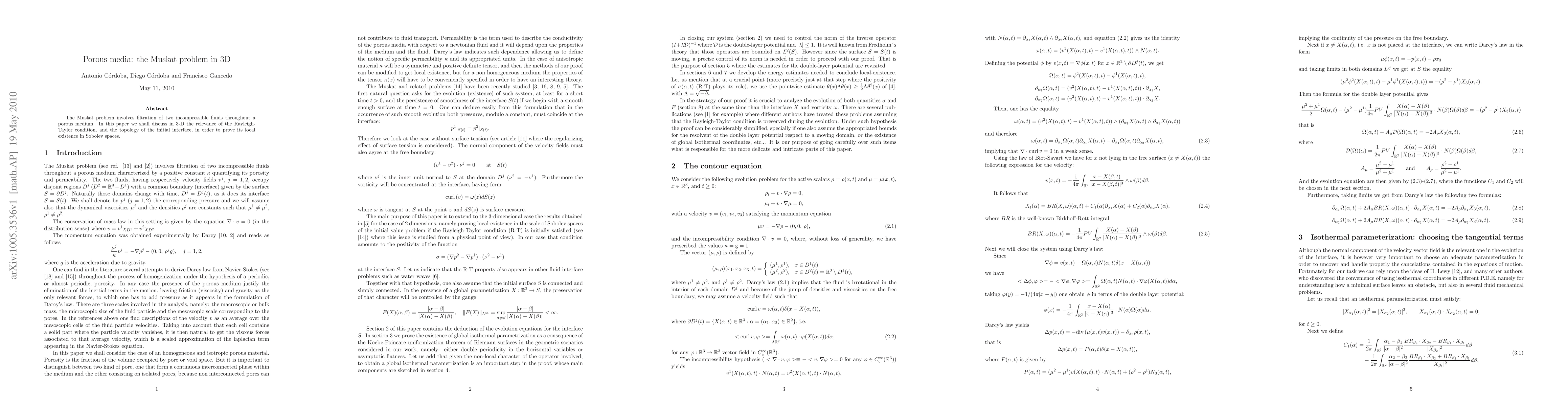 The Muskat problem involves filtration of two incompressible fluids throughout a porous medium. In this paper we shall discuss in 3-D the relevance of the Rayleigh-Taylor condition, and the topology of the initial interface, in order to prove its local existence in Sobolev spaces.