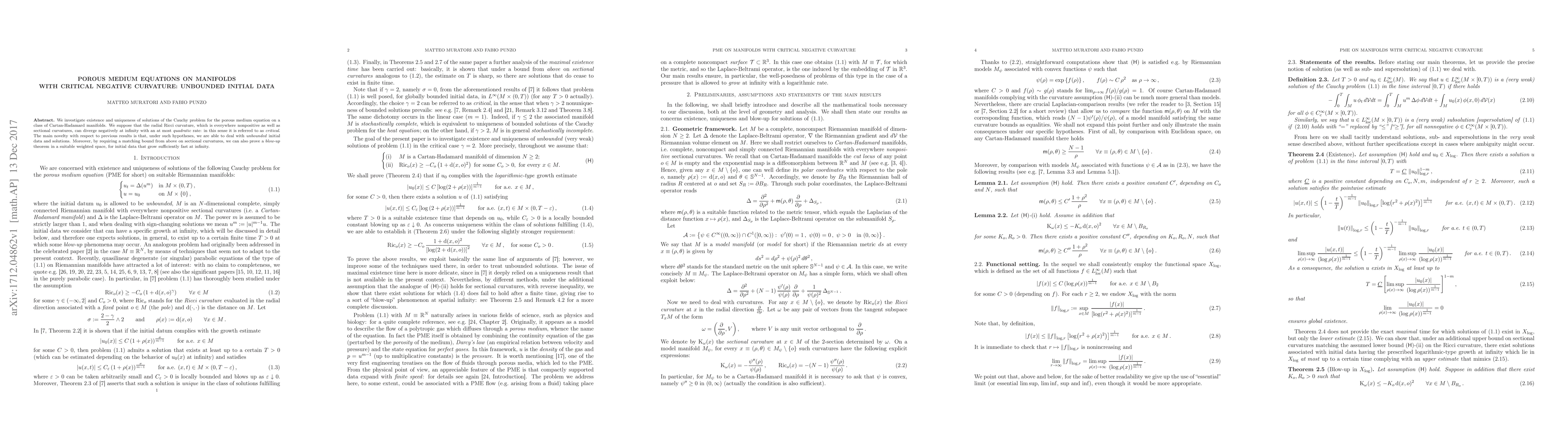 The paper investigates solutions to the porous medium equation on manifolds with critical negative curvature, including unbounded initial data, and proves a blow-up theorem for certain types of initial data.