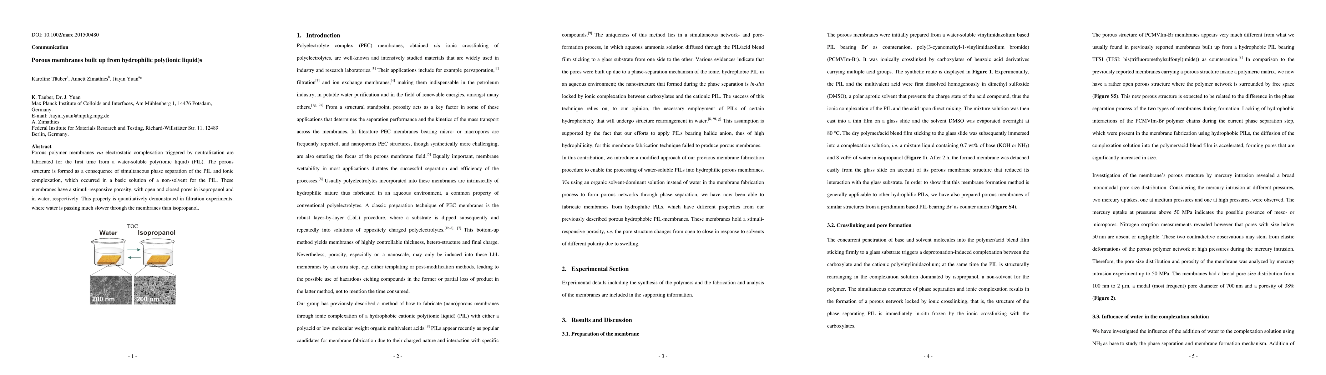 This paper presents the first fabrication of porous polymer membranes from water-soluble poly(ionic liquid)s (PIL) through electrostatic complexation and neutralization. The membranes exhibit stimuli-responsive porosity, allowing for selective filtration of water and isopropanol.