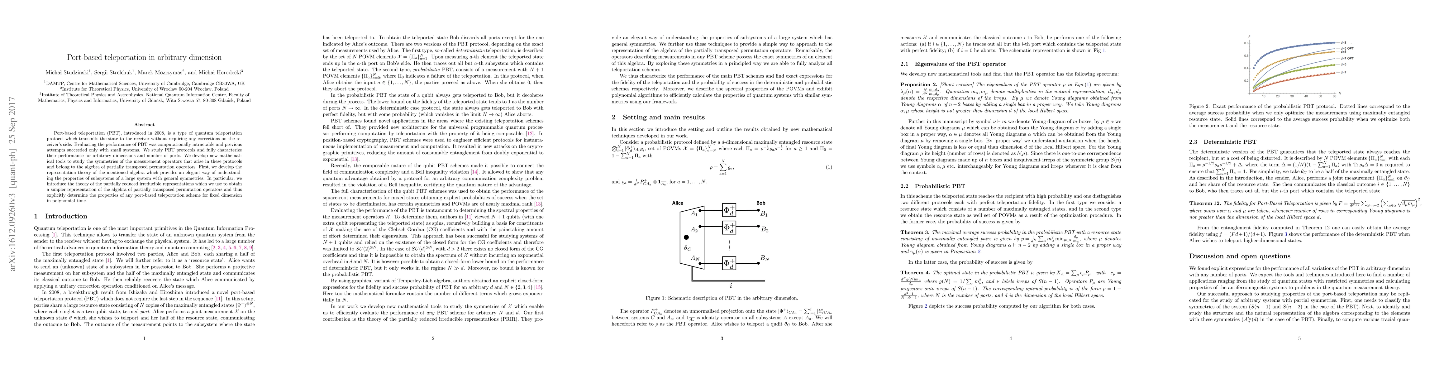 Port-based teleportation (PBT), introduced in 2008, is a type of quantum teleportation protocol which transmits the state to the receiver without requiring any corrections on the receiver's side. Evaluating the performance of PBT was computationally intractable and previous attempts succeeded only with small systems. We study PBT protocols and fully characterize their performance for arbitrary dimensions and number of ports. We develop new mathematical tools to study the symmetries of the measurement operators that arise in these protocols and belong to the algebra of partially transposed permutation operators. First, we develop the representation theory of the mentioned algebra which provides an elegant way of understanding the properties of subsystems of a large system with general symmetries. In particular, we introduce the theory of the partially reduced irreducible representations which we use to obtain a simpler representation of the algebra of partially transposed permutation operators and thus explicitly determine the properties of any PBT scheme for fixed dimension in polynomial time.