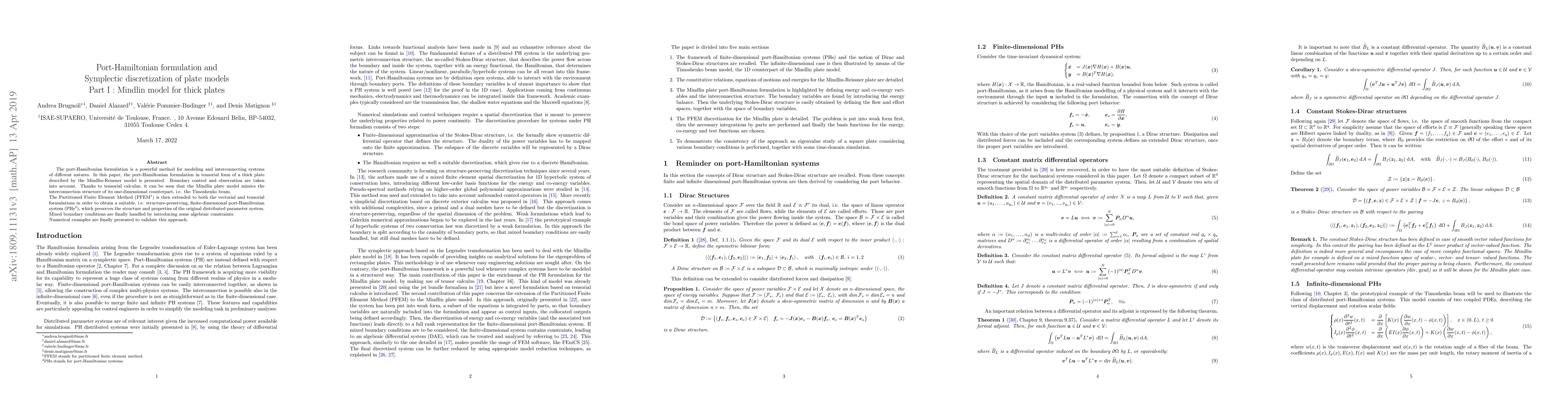 The port-Hamiltonian formulation is a powerful method for modeling and interconnecting systems of different natures. In this paper, the port-Hamiltonian formulation in tensorial form of a thick plate described by the Mindlin-Reissner model is presented. Boundary control and observation are taken into account. Thanks to tensorial calculus, it can be seen that the Mindlin plate model mimics the interconnection structure of its one-dimensional counterpart, i.e. the Timoshenko beam. The Partitioned Finite Element Method (PFEM) is then extended to both the vectorial and tensorial formulations in order to obtain a suitable, i.e. structure-preserving, finite-dimensional port-Hamiltonian system (PHs), which preserves the structure and properties of the original distributed parameter system. Mixed boundary conditions are finally handled by introducing some algebraic constraints. Numerical examples are finally presented to validate this approach.