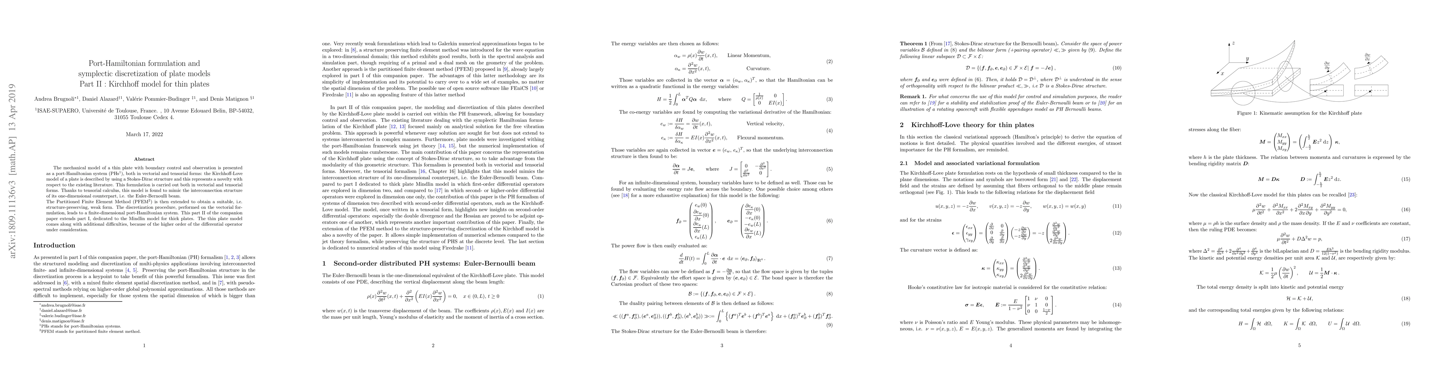 The mechanical model of a thin plate with boundary control and observation is presented as a port-Hamiltonian system (pHs), both in vectorial and tensorial forms: the Kirchhoff-Love model of a plate is described by using a Stokes-Dirac structure and this represents a novelty with respect to the existing literature. This formulation is carried out both in vectorial and tensorial forms. Thanks to tensorial calculus, this model is found to mimic the interconnection structure of its one-dimensional counterpart, i.e. the Euler-Bernoulli beam. The Partitioned Finite Element Method (PFEM) is then extended to obtain a suitable, i.e. structure-preserving, weak form. The discretization procedure, performed on the vectorial formulation, leads to a finite-dimensional port-Hamiltonian system. This part II of the companion paper extends part I, dedicated to the Mindlin model for thick plates. The thin plate model comes along with additional difficulties, because of the higher order of the differential operator under consideration.