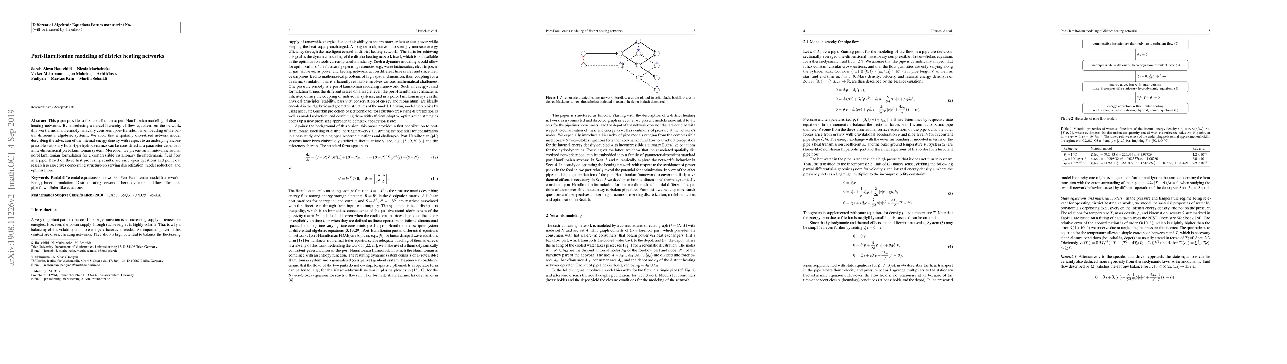 This paper introduces a port-Hamiltonian modeling approach for district heating networks, presenting a thermodynamically consistent framework for both spatially discretized and infinite-dimensional systems. It raises open questions for further research on structure-preserving discretization, model reduction, and optimization.