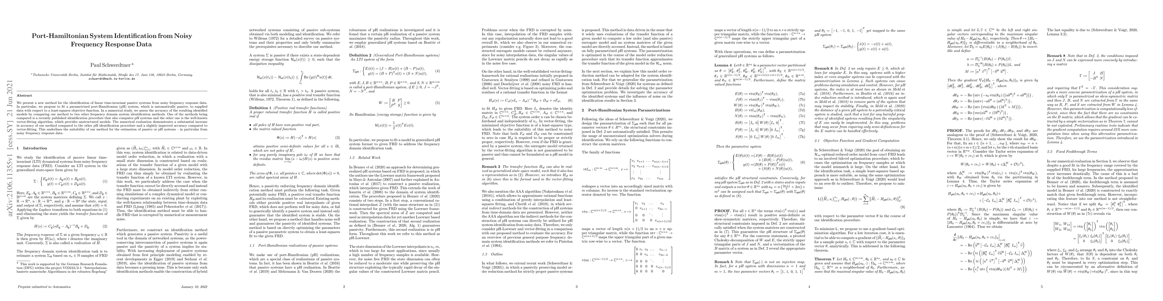 This paper introduces a novel method for identifying linear time-invariant passive systems using a parametrized port-Hamiltonian approach from noisy frequency response data. The proposed method shows significantly higher accuracy compared to other pH identification techniques and slightly better than the vector-fitting algorithm.