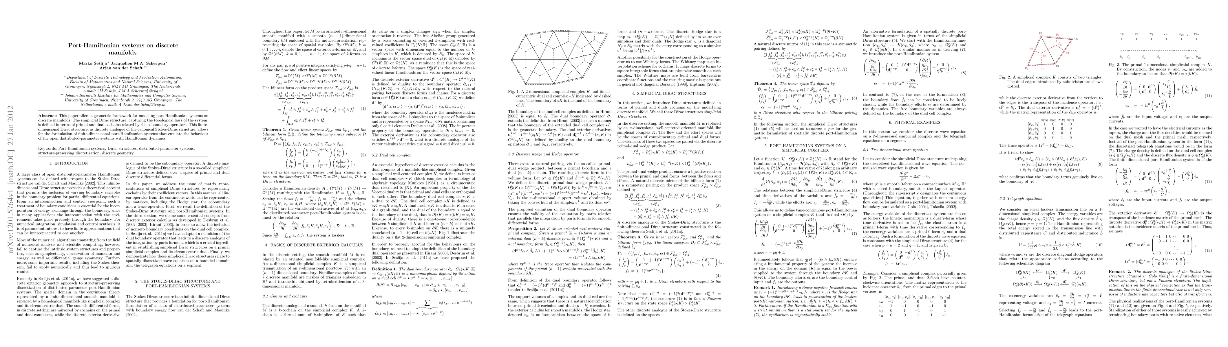 This paper introduces a geometric framework for modeling port-Hamiltonian systems on discrete manifolds using simplicial Dirac structures, enabling the representation of open distributed-parameter systems with Hamiltonian dynamics in a finite-dimensional setting.