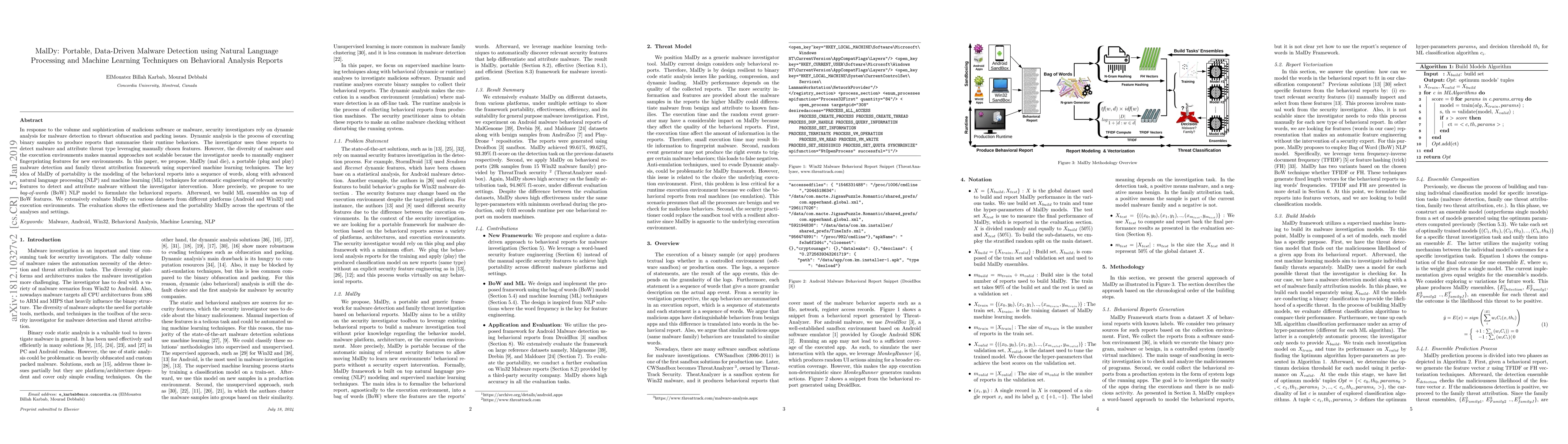 In response to the volume and sophistication of malicious software or malware, security investigators rely on dynamic analysis for malware detection to thwart obfuscation and packing issues. Dynamic analysis is the process of executing binary samples to produce reports that summarise their runtime behaviors. The investigator uses these reports to detect malware and attribute threat type leveraging manually chosen features. However, the diversity of malware and the execution environments makes manual approaches not scalable because the investigator needs to manually engineer fingerprinting features for new environments. In this paper, we propose, MalDy (mal~die), a portable (plug and play) malware detection and family threat attribution framework using supervised machine learning techniques. The key idea of MalDy portability is the modeling of the behavioral reports into a sequence of words, along with advanced natural language processing (NLP) and machine learning (ML) techniques for automatic engineering of relevant security features to detect and attribute malware without the investigator intervention. More precisely, we propose to use bag-of-words (BoW) NLP model to formulate the behavioral reports. Afterward, we build ML ensembles on top of BoW features. We extensively evaluate MalDy on various datasets from different platforms (Android and Win32) and execution environments. The evaluation shows the effectiveness and the portability MalDy across the spectrum of the analyses and settings.