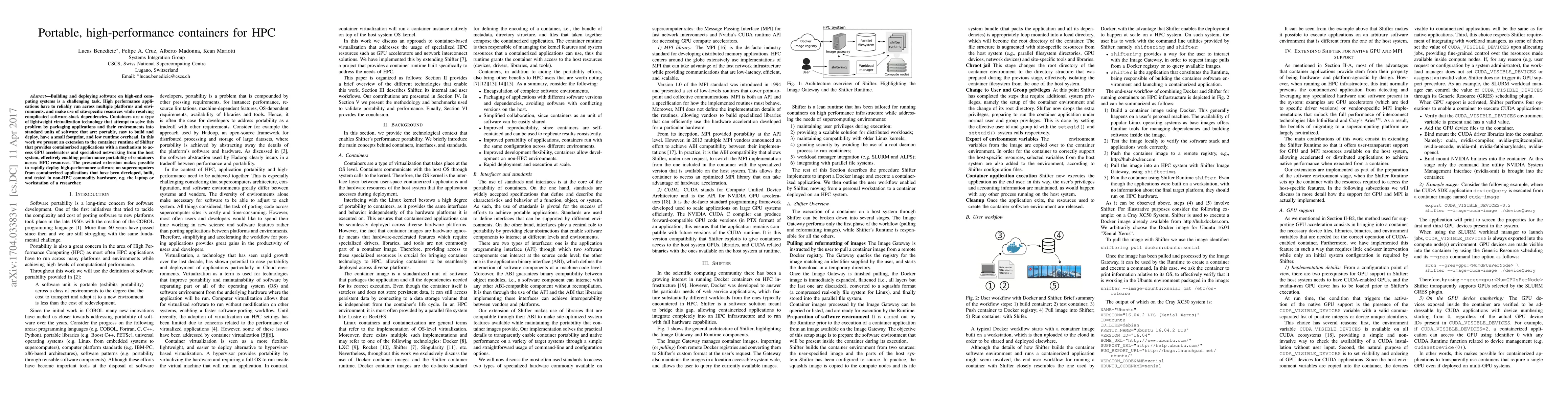 The research presents an extension to the Shifter container runtime that enables high-performance applications to access GPU accelerators and specialized networking from the host system, ensuring performance portability across HPC resources. The work details the Shifter workflow, which includes building, testing, pushing Docker images to a registry, pulling them into an HPC system with Shifter Image Gateway, and running the container using Shifter Runtime.