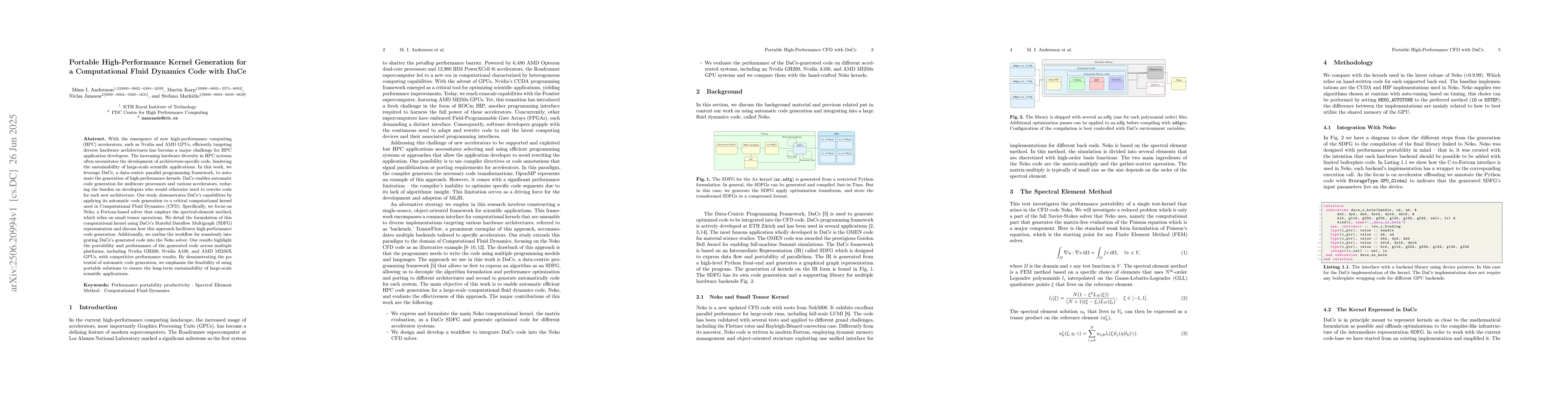 The work introduces a systematic approach for automatic kernel generation using DaCe, incorporating advanced optimization passes that enable performance portability for CFD kernels across heterogeneous architectures.