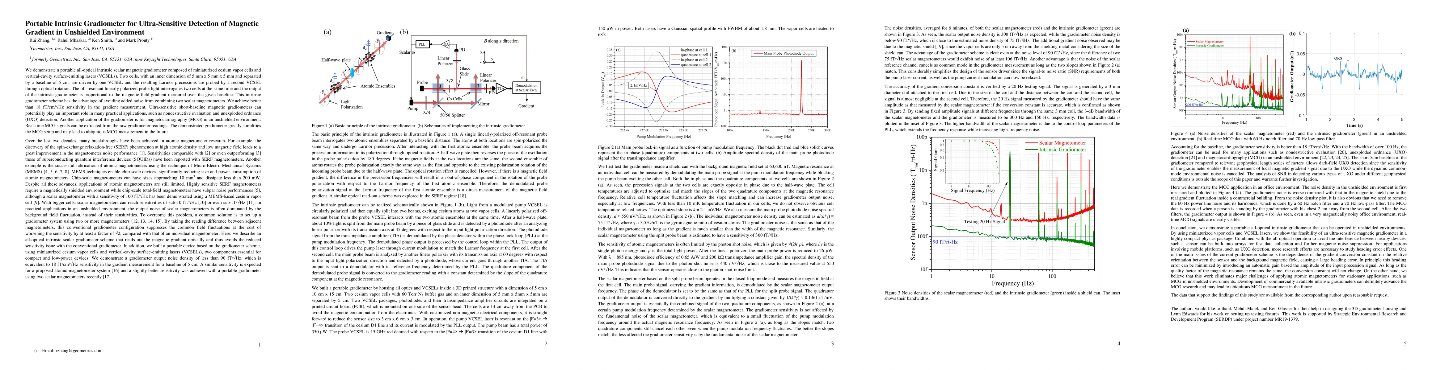 This paper presents a portable all-optical intrinsic magnetic gradiometer using miniaturized cesium vapor cells and VCSELs, achieving ultra-sensitive detection of magnetic gradients in unshielded environments with a sensitivity of better than 18 fT/cm/rt-Hz. Potential applications include nondestructive evaluation, UXO detection, and simplified magnetocardiography (MCG).