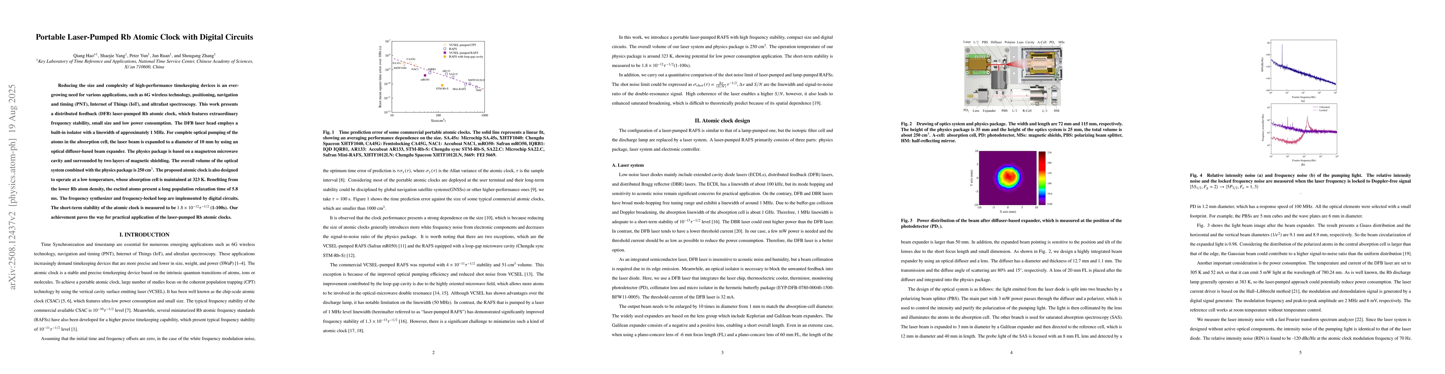 This research introduces a compact, low-power Rb atomic clock using a DFB laser for improved frequency stability, achieving a volume of 250 cm³ and 1.8×10⁻¹² stability (1-100s). Digital circuits are employed for frequency synthesizer and locked-loop, marking a step towards practical applications in 6G, PNT, IoT, and ultrafast spectroscopy.