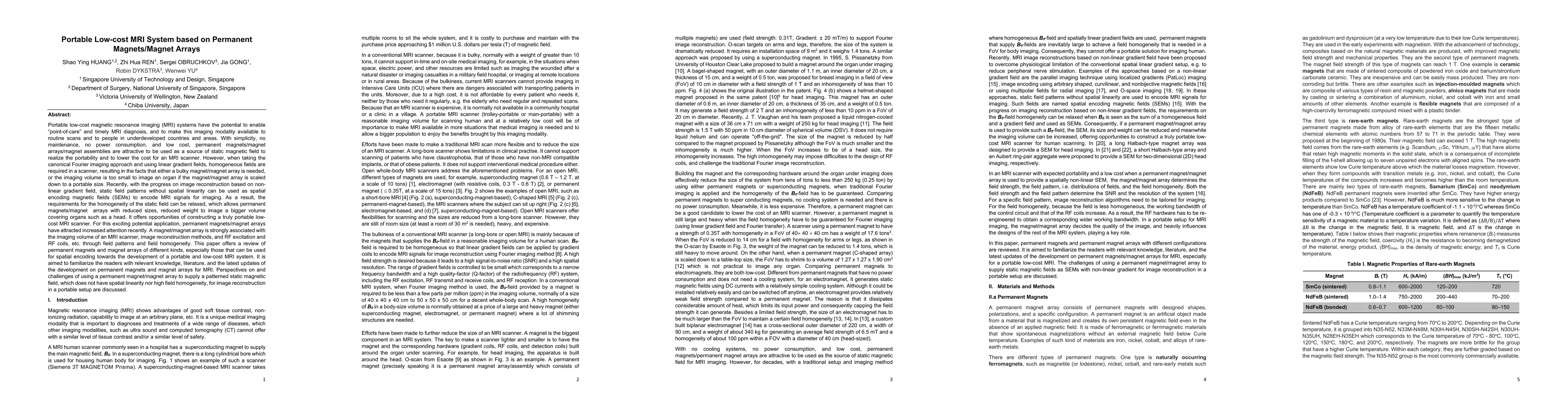 This paper reviews the use of permanent magnets and arrays for developing portable, low-cost MRI systems, emphasizing the relaxation of magnetic field homogeneity requirements through non-linear gradient field reconstruction methods. It discusses the challenges and perspectives of employing such magnets for point-of-care imaging in underdeveloped areas.