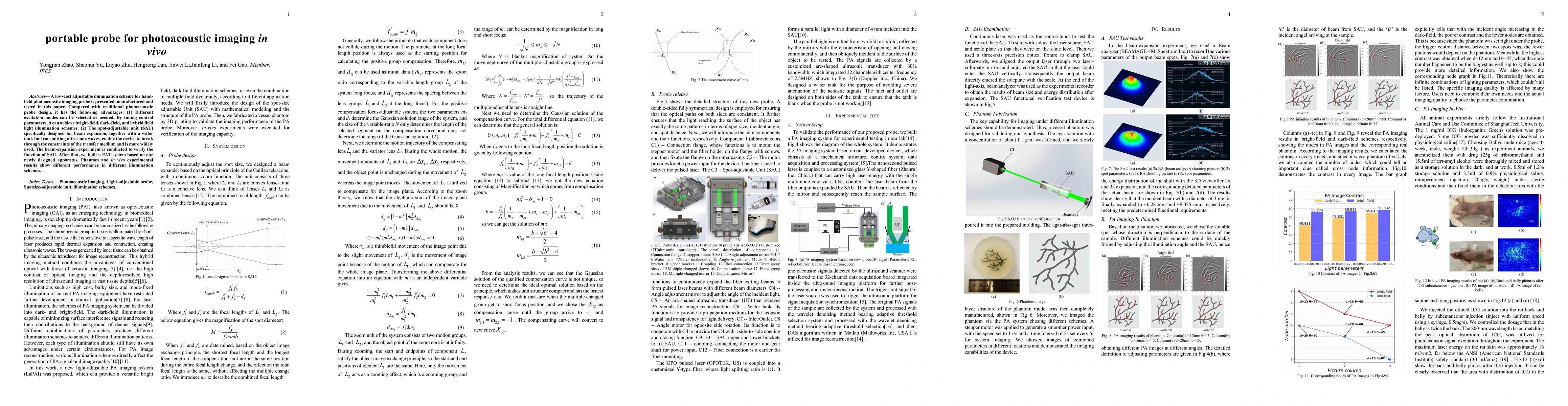 A low-cost adjustable illumination scheme for hand-held photoacoustic imaging probe is presented, manufactured and tested in this paper. Compared with traditional photoacoustic probe design, it has the following advantages: (1) Different excitation modes can be selected as needed. By tuning control parameters, it can achieve bright-field, dark-field, and hybrid field light illumination schemes. (2) The spot-adjustable unit (SAU) specifically designed for beam expansion, together with a water tank for transmitting ultrasonic waves, enable the device to break through the constraints of the transfer medium and is more widely used. The beam-expansion experiment is conducted to verify the function of SAU. After that, we built a PAT system based on our newly designed apparatus. Phantom and in vivo experimental results show different performance in different illumination schemes