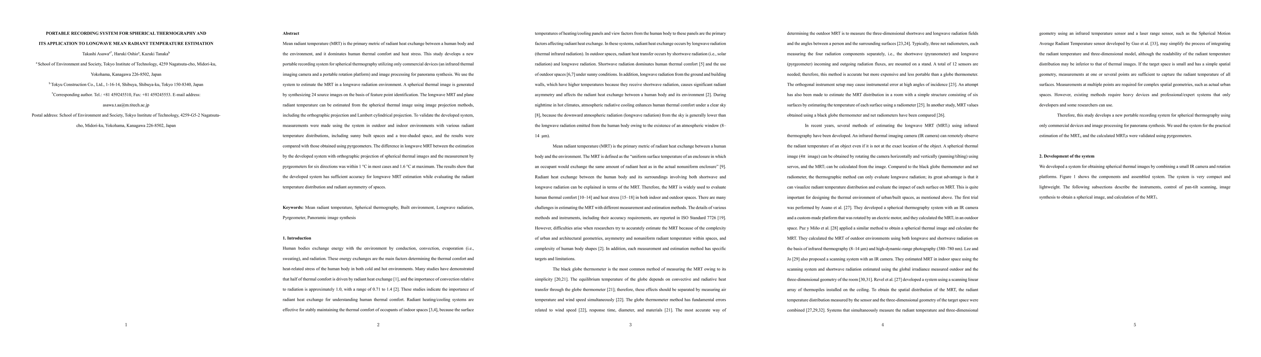 This study introduces a portable thermography system for estimating mean radiant temperature using an infrared thermal imaging camera and a rotation platform. The system synthesizes spherical thermal images to accurately estimate longwave MRT, validated with pyrgeometers, showing an accuracy within 1°C in most cases.