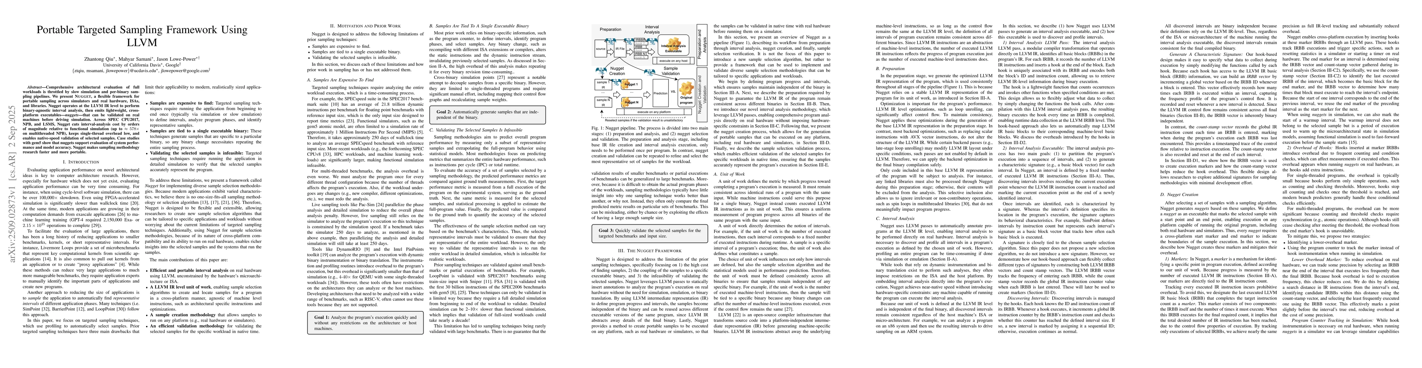 Comprehensive architectural evaluation of full workloads is throttled by slow simulation and per-binary sampling pipelines. We present Nugget, a flexible framework for portable sampling across simulators and real hardware, ISAs, and libraries. Nugget operates at the LLVM IR level to perform binary-agnostic interval analysis, then emits lightweight, cross-platform executables--nuggets--that can be validated on real machines before driving simulation. Across SPEC CPU2017, NPB, and LSMS, Nugget cuts interval-analysis cost by orders of magnitude relative to functional simulation (up to ~578X on multithreaded NPB), keeps single-thread overhead low, and enables native-speed validation of selected samples. Case studies with gem5 show that nuggets support evaluation of system performance and model accuracy. Nugget makes sampling methodology research faster and more portable.