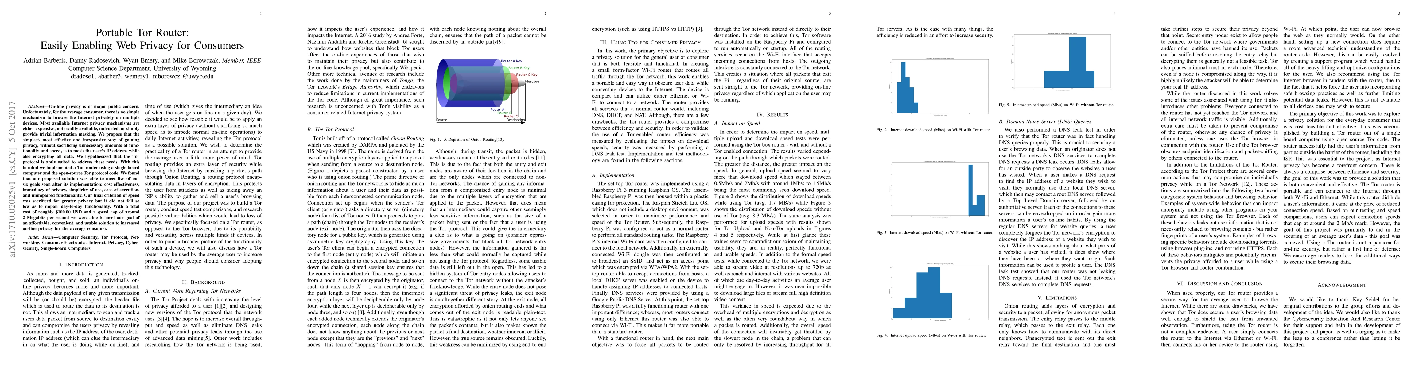 On-line privacy is of major public concern. Unfortunately, for the average consumer, there is no simple mechanism to browse the Internet privately on multiple devices. Most available Internet privacy mechanisms are either expensive, not readily available, untrusted, or simply provide trivial information masking. We propose that the simplest, most effective and inexpensive way of gaining privacy, without sacrificing unnecessary amounts of functionality and speed, is to mask the user's IP address while also encrypting all data. We hypothesized that the Tor protocol is aptly suited to address these needs. With this in mind we implemented a Tor router using a single board computer and the open-source Tor protocol code. We found that our proposed solution was able to meet five of our six goals soon after its implementation: cost effectiveness, immediacy of privacy, simplicity of use, ease of execution, and unimpaired functionality. Our final criterion of speed was sacrificed for greater privacy but it did not fall so low as to impair day-to-day functionality. With a total cost of roughly $100.00 USD and a speed cap of around 2 Megabits per second we were able to meet our goal of an affordable, convenient, and usable solution to increased on-line privacy for the average consumer.