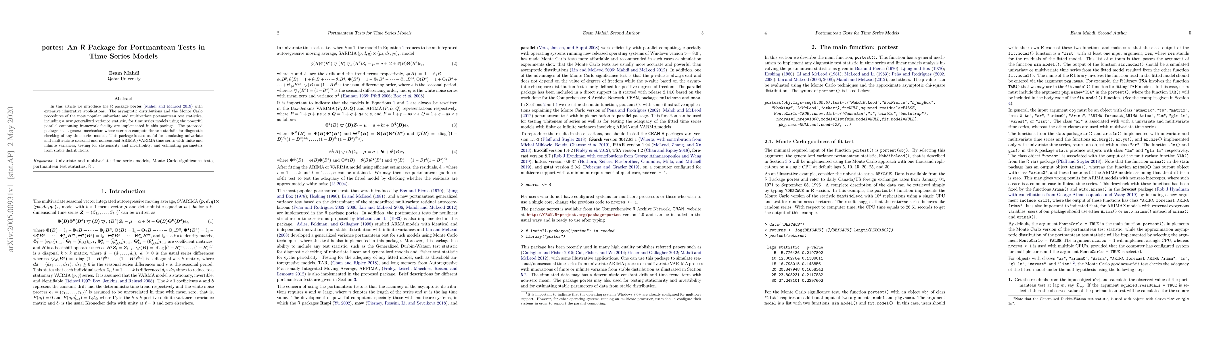 The portes R package offers extensive tools for implementing and applying popular univariate and multivariate portmanteau tests in time series models, including a new generalized variance statistic, with support for parallel computing. It also facilitates simulation and diagnostics for ARIMA/VARIMA models.
