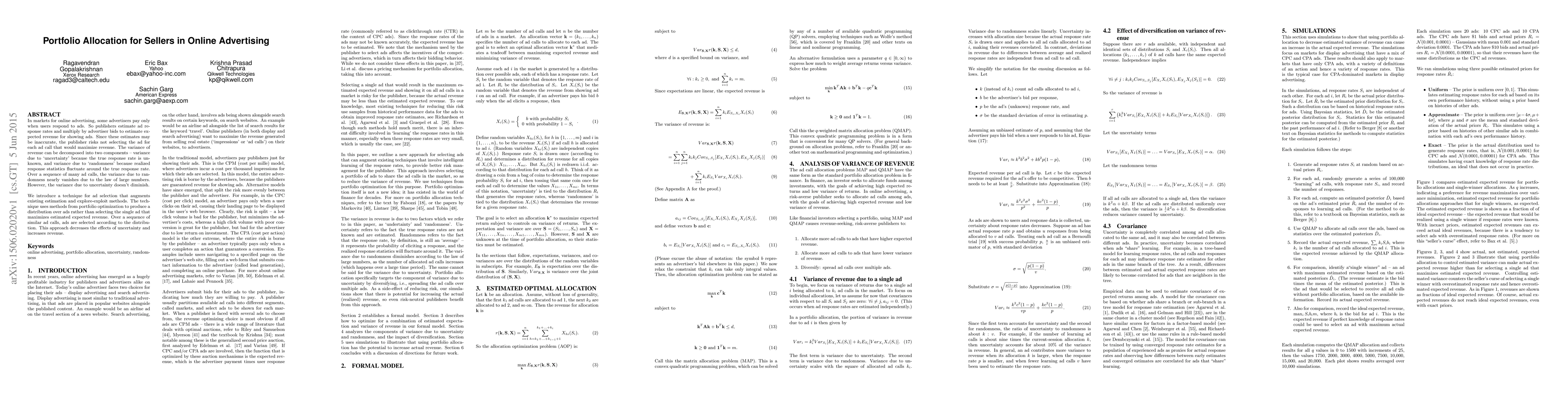 This paper proposes a portfolio optimization technique for ad selection in online advertising markets, aiming to reduce revenue variance due to uncertainty in response rates. Instead of choosing the single ad with the highest estimated revenue, the method selects ads according to a distribution, thereby mitigating the impact of fluctuating response statistics and improving overall revenue.