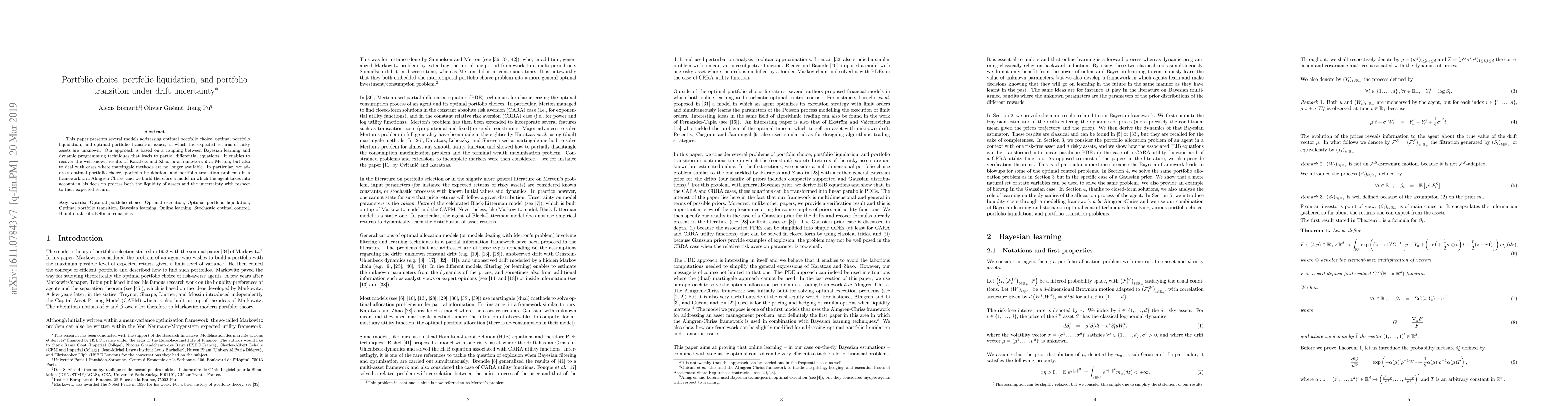This paper develops models for optimal portfolio choice, liquidation, and transition under drift uncertainty, using Bayesian learning and dynamic programming to solve problems where asset returns are unknown. It extends existing frameworks to incorporate liquidity and uncertainty, providing solutions applicable beyond traditional martingale methods.