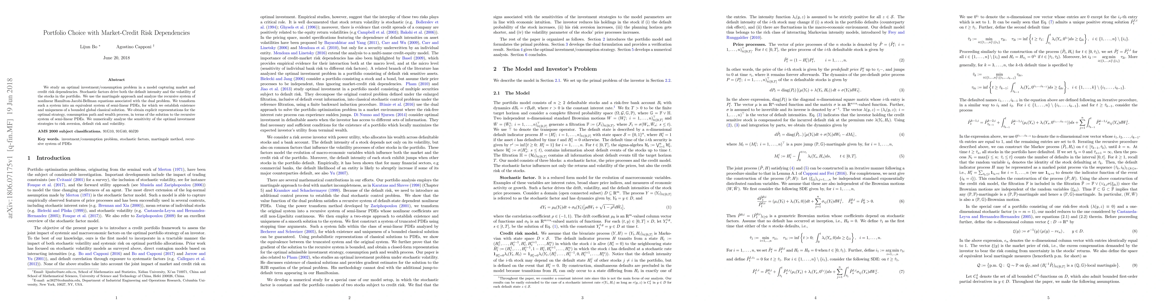 We study an optimal investment/consumption problem in a model capturing market and credit risk dependencies. Stochastic factors drive both the default intensity and the volatility of the stocks in the portfolio. We use the martingale approach and analyze the recursive system of nonlinear Hamilton-Jacobi-Bellman equations associated with the dual problem. We transform such a system into an equivalent system of semi-linear PDEs, for which we establish existence and uniqueness of a bounded global classical solution. We obtain explicit representations for the optimal strategy, consumption path and wealth process, in terms of the solution to the recursive system of semi-linear PDEs. We numerically analyze the sensitivity of the optimal investment strategies to risk aversion, default risk and volatility.