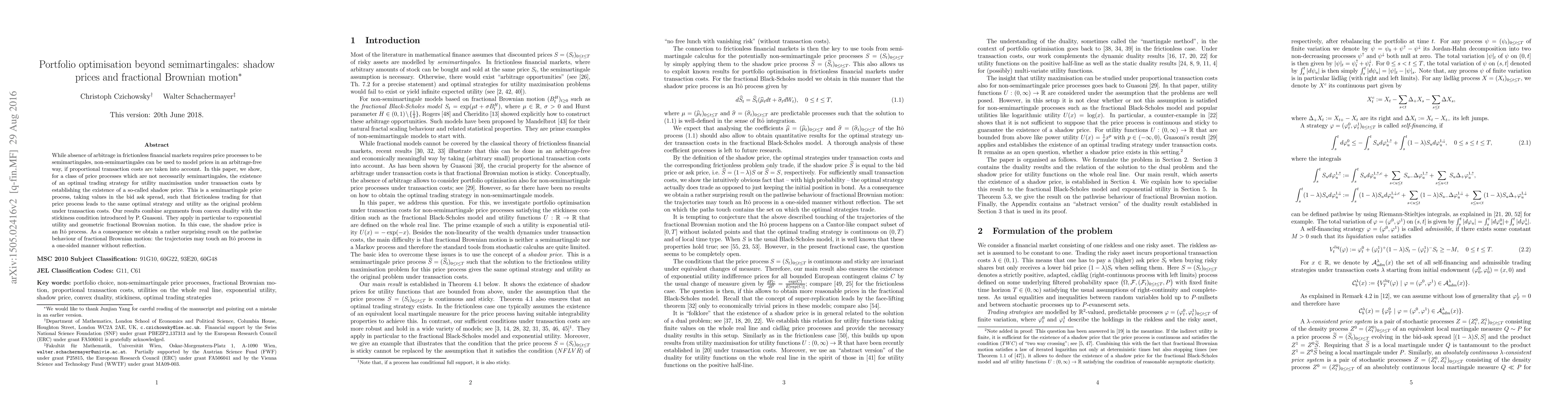 This paper explores portfolio optimization for price processes that are not semimartingales, introducing the concept of shadow prices to account for transaction costs. It establishes the existence of an optimal trading strategy through convex duality and the stickiness condition, particularly applicable to exponential utility and fractional Brownian motion.