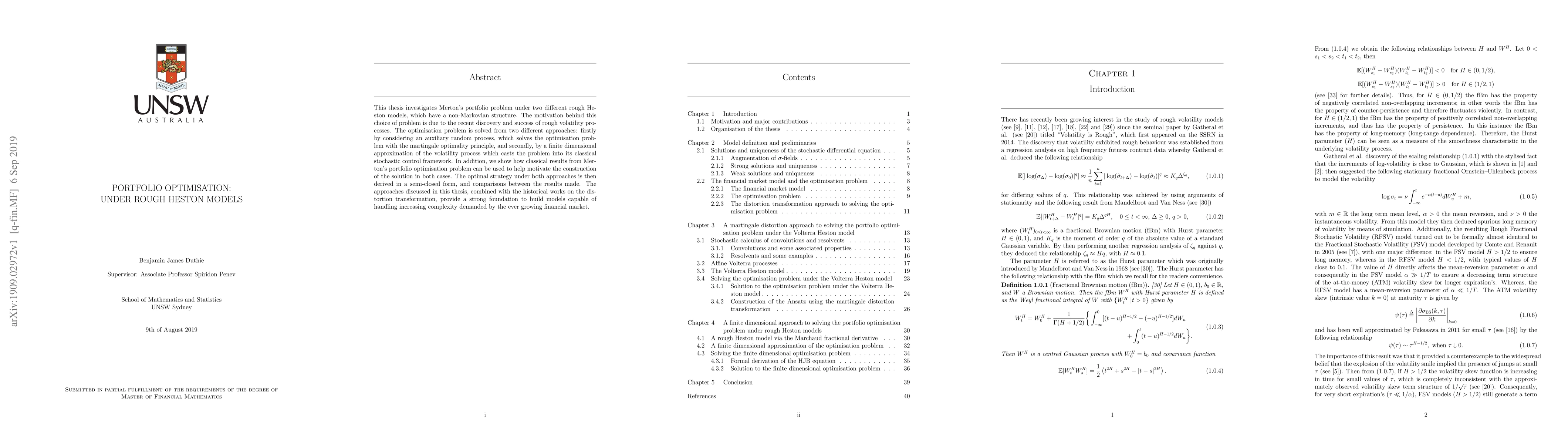 This thesis investigates Merton's portfolio problem under two different rough Heston models, which have a non-Markovian structure. The motivation behind this choice of problem is due to the recent discovery and success of rough volatility processes. The optimisation problem is solved from two different approaches: firstly by considering an auxiliary random process, which solves the optimisation problem with the martingale optimality principle, and secondly, by a finite dimensional approximation of the volatility process which casts the problem into its classical stochastic control framework. In addition, we show how classical results from Merton's portfolio optimisation problem can be used to help motivate the construction of the solution in both cases. The optimal strategy under both approaches is then derived in a semi-closed form, and comparisons between the results made. The approaches discussed in this thesis, combined with the historical works on the distortion transformation, provide a strong foundation to build models capable of handling increasing complexity demanded by the ever growing financial market.