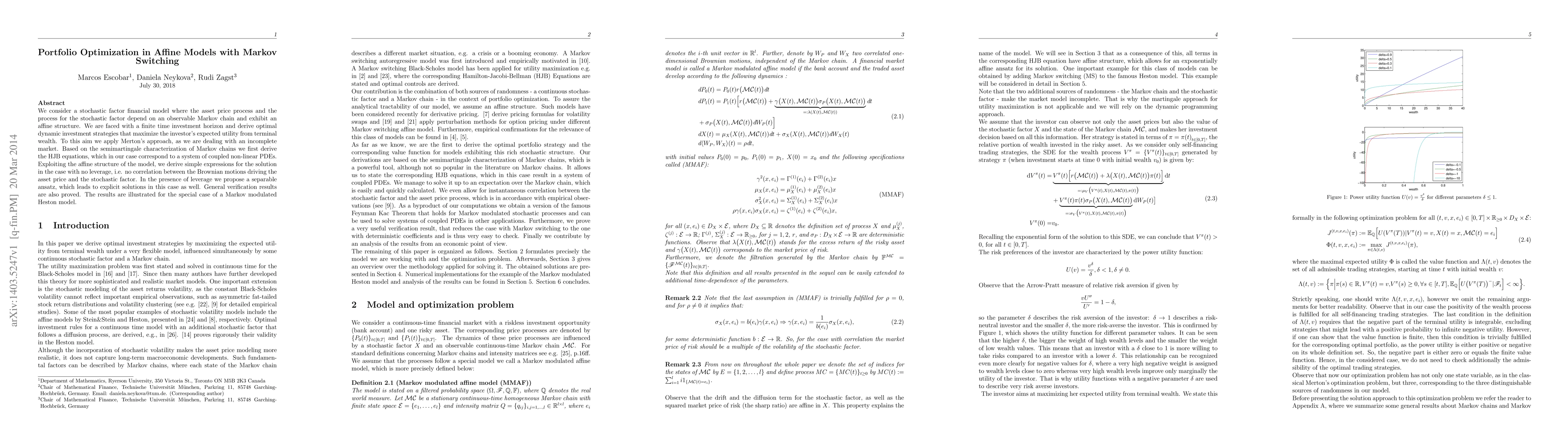 We consider a stochastic factor financial model where the asset price process and the process for the stochastic factor depend on an observable Markov chain and exhibit an affine structure. We are faced with a finite time investment horizon and derive optimal dynamic investment strategies that maximize the investor's expected utility from terminal wealth. To this aim we apply Merton's approach, as we are dealing with an incomplete market. Based on the semimartingale characterization of Markov chains we first derive the HJB equations, which in our case correspond to a system of coupled non-linear PDEs. Exploiting the affine structure of the model, we derive simple expressions for the solution in the case with no leverage, i.e. no correlation between the Brownian motions driving the asset price and the stochastic factor. In the presence of leverage we propose a separable ansatz, which leads to explicit solutions in this case as well. General verification results are also proved. The results are illustrated for the special case of a Markov modulated Heston model.