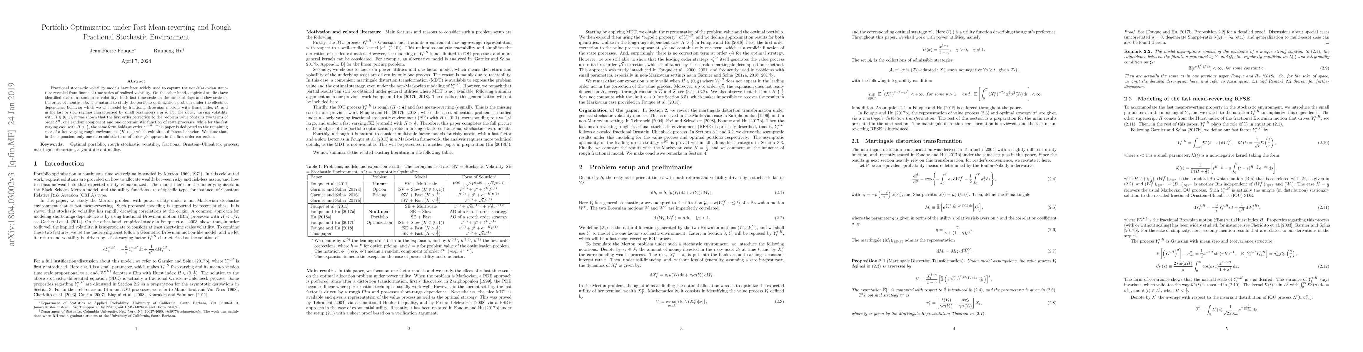 This paper investigates portfolio optimization under fast mean-reverting fractional stochastic environments with different volatility behaviors, finding a unique deterministic correction term in the fast-varying rough environment case.
