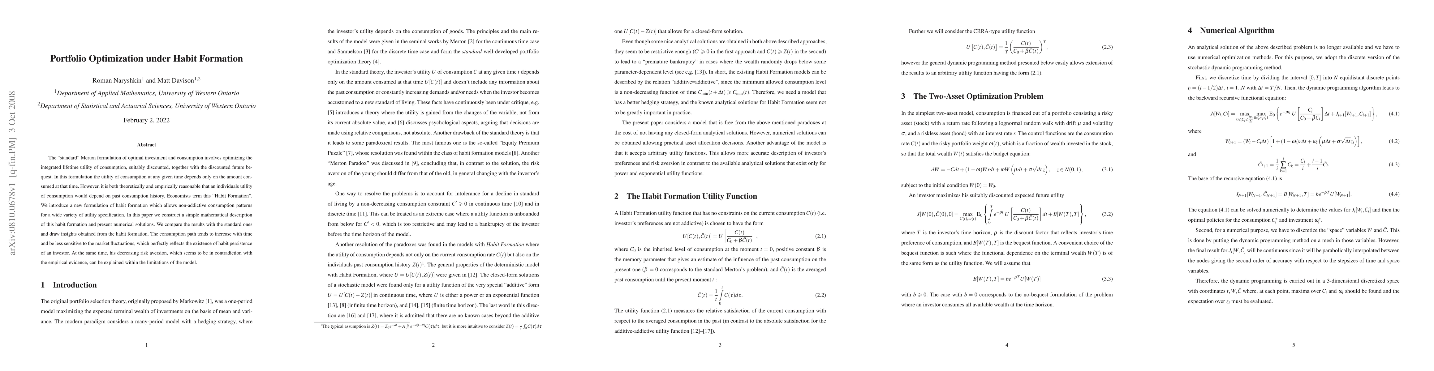 The "standard" Merton formulation of optimal investment and consumption involves optimizing the integrated lifetime utility of consumption, suitably discounted, together with the discounted future bequest. In this formulation the utility of consumption at any given time depends only on the amount consumed at that time. However, it is both theoretically and empirically reasonable that an individuals utility of consumption would depend on past consumption history. Economists term this "Habit Formation". We introduce a new formulation of habit formation which allows non-addictive consumption patterns for a wide variety of utility specification. In this paper we construct a simple mathematical description of this habit formation and present numerical solutions. We compare the results with the standard ones and draw insights obtained from the habit formation. The consumption path tends to increase with time and be less sensitive to the market fluctuations, which perfectly reflects the existence of habit persistence of an investor. At the same time, his decreasing risk aversion, which seems to be in contradiction with the empirical evidence, can be explained within the limitations of the model.