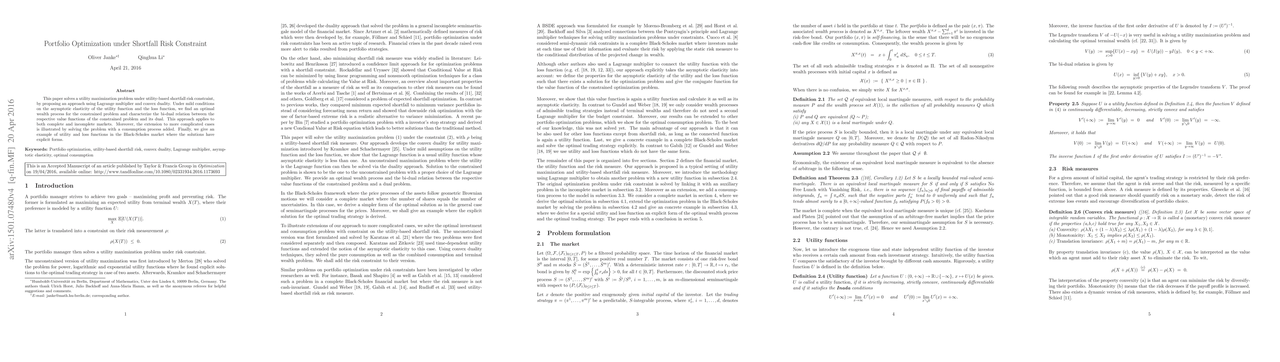 This paper solves a utility maximization problem under utility-based shortfall risk constraint, by proposing an approach using Lagrange multiplier and convex duality. Under mild conditions on the asymptotic elasticity of the utility function and the loss function, we find an optimal wealth process for the constrained problem and characterize the bi-dual relation between the respective value functions of the constrained problem and its dual. This approach applies to both complete and incomplete markets. Moreover, the extension to more complicated cases is illustrated by solving the problem with a consumption process added. Finally, we give an example of utility and loss functions in the Black-Scholes market where the solutions have explicit forms.