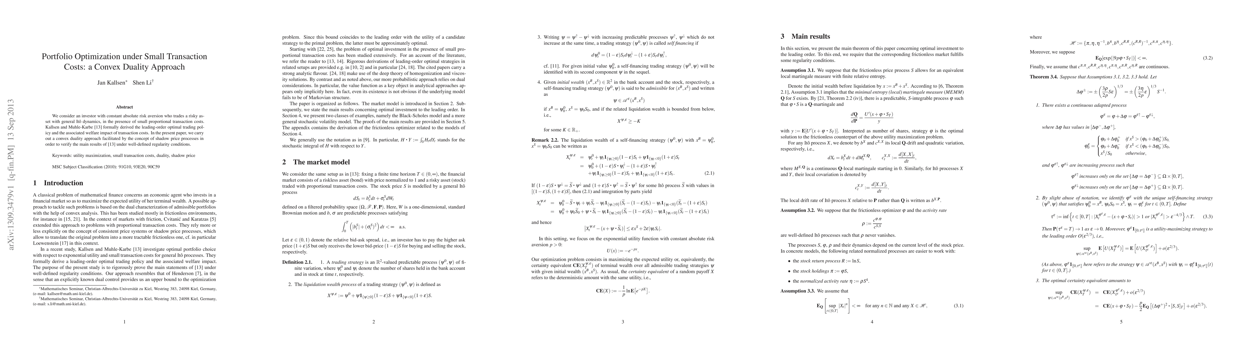 This paper employs a convex duality approach to verify the optimal trading policy and welfare impact of small transaction costs for an investor with constant absolute risk aversion, building on the foundational work of Kallsen and Muhle-Karbe (2012). It utilizes shadow price processes to establish the results under specified regularity conditions.