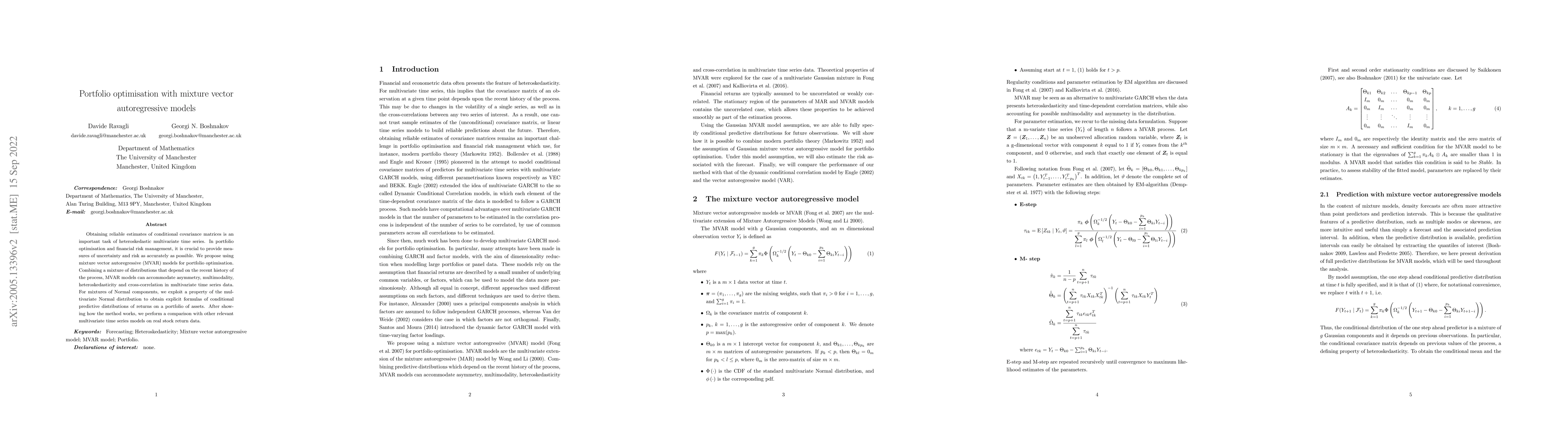 This paper proposes using mixture vector autoregressive (MVAR) models for portfolio optimization, leveraging their ability to handle asymmetry, multimodality, heteroskedasticity, and cross-correlation in multivariate time series. The authors derive explicit formulas for conditional predictive distributions of portfolio returns and compare their method against other models using real stock return data.