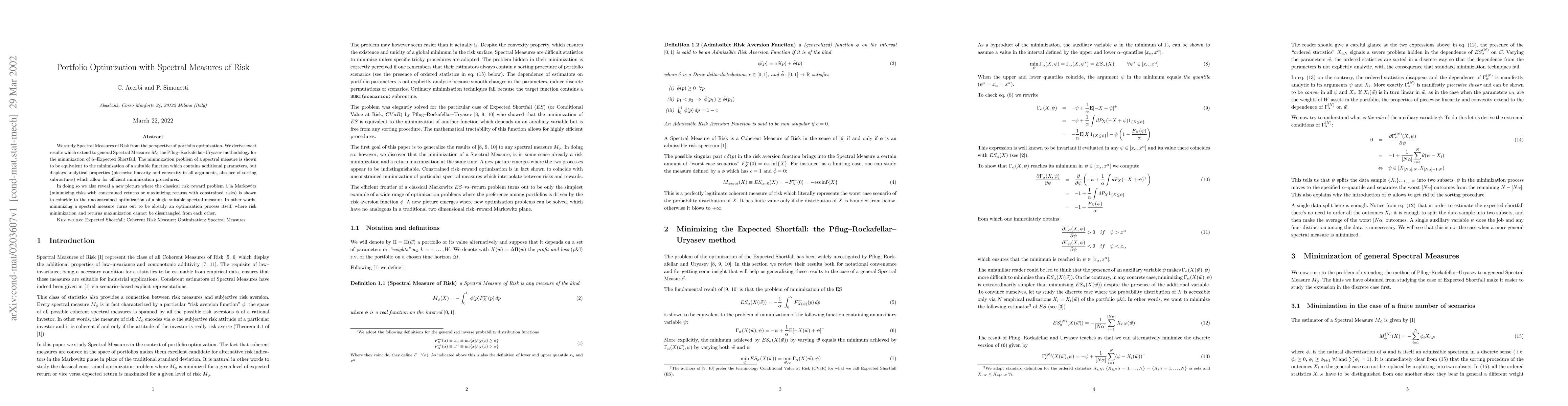 We study Spectral Measures of Risk from the perspective of portfolio optimization. We derive exact results which extend to general Spectral Measures M_phi the Pflug--Rockafellar--Uryasev methodology for the minimization of alpha--Expected Shortfall. The minimization problem of a spectral measure is shown to be equivalent to the minimization of a suitable function which contains additional parameters, but displays analytical properties (piecewise linearity and convexity in all arguments, absence of sorting subroutines) which allow for efficient minimization procedures. In doing so we also reveal a new picture where the classical risk--reward problem a la Markowitz (minimizing risks with constrained returns or maximizing returns with constrained risks) is shown to coincide to the unconstrained optimization of a single suitable spectral measure. In other words, minimizing a spectral measure turns out to be already an optimization process itself, where risk minimization and returns maximization cannot be disentangled from each other.