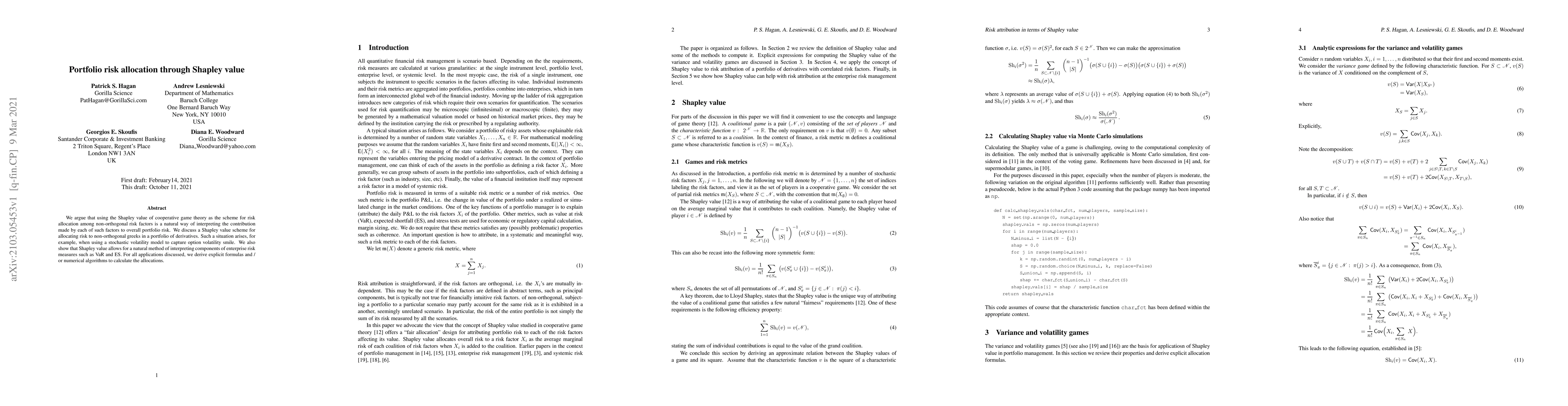 We argue that using the Shapley value of cooperative game theory as the scheme for risk allocation among non-orthogonal risk factors is a natural way of interpreting the contribution made by each of such factors to overall portfolio risk. We discuss a Shapley value scheme for allocating risk to non-orthogonal greeks in a portfolio of derivatives. Such a situation arises, for example, when using a stochastic volatility model to capture option volatility smile. We also show that Shapley value allows for a natural method of interpreting components of enterprise risk measures such as VaR and ES. For all applications discussed, we derive explicit formulas and / or numerical algorithms to calculate the allocations.