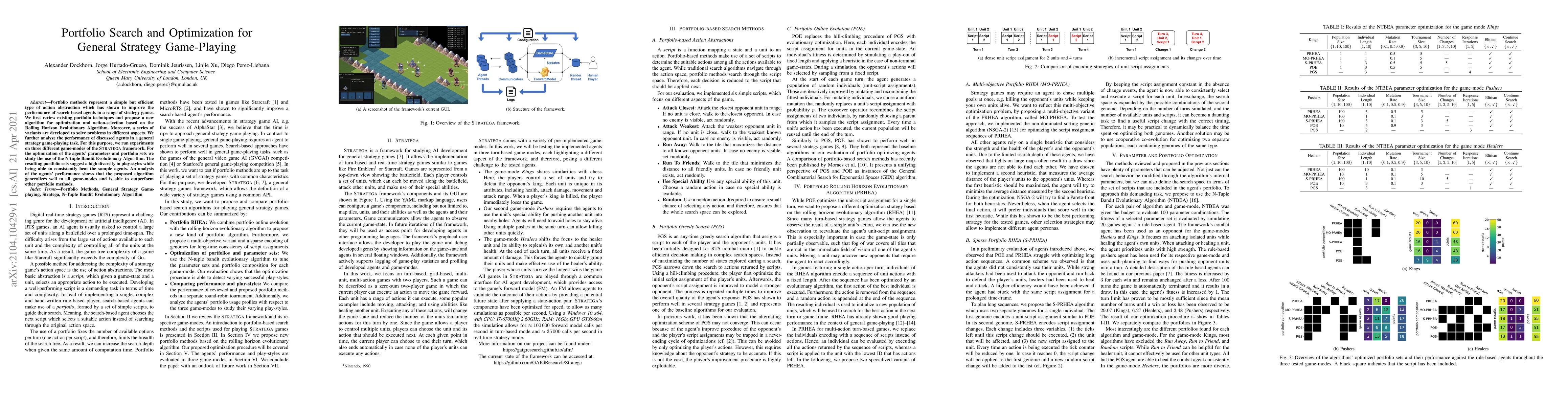 This paper proposes a new portfolio search and optimization algorithm for strategy game-playing, utilizing the Rolling Horizon Evolutionary Algorithm and N-tuple Bandit Evolutionary Algorithm for parameter and portfolio optimization. Experiments in various game-modes of the Stratega framework demonstrate the algorithm's high diversity in play-styles and superior performance over other portfolio methods.