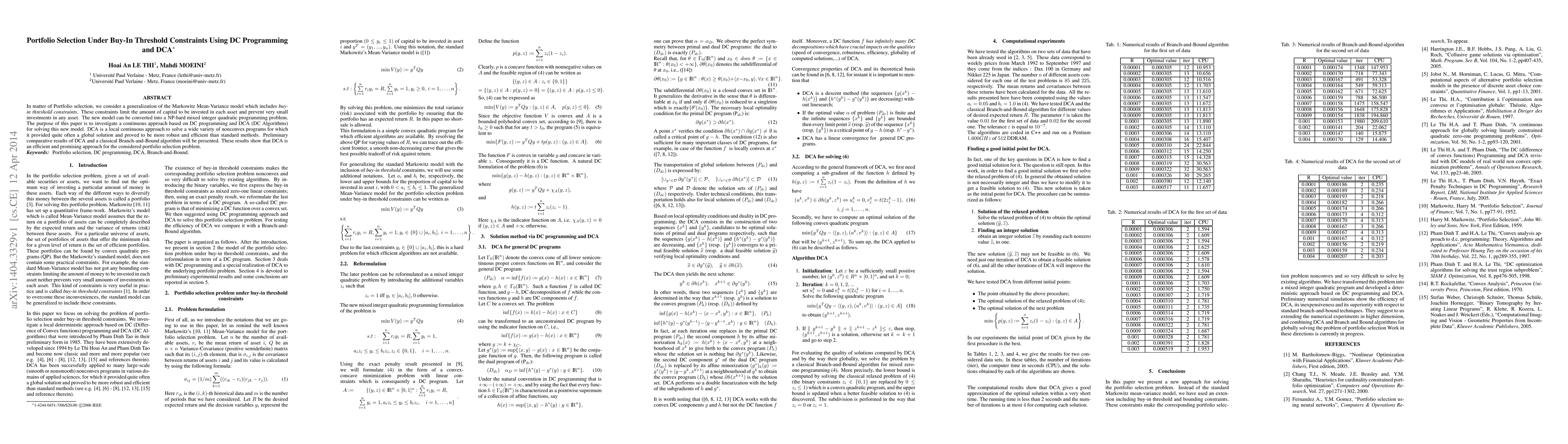 In matter of Portfolio selection, we consider a generalization of the Markowitz Mean-Variance model which includes buy-in threshold constraints. These constraints limit the amount of capital to be invested in each asset and prevent very small investments in any asset. The new model can be converted into a NP-hard mixed integer quadratic programming problem. The purpose of this paper is to investigate a continuous approach based on DC programming and DCA for solving this new model. DCA is a local continuous approach to solve a wide variety of nonconvex programs for which it provided quite often a global solution and proved to be more robust and efficient than standard methods. Preliminary comparative results of DCA and a classical Branch-and-Bound algorithm will be presented. These results show that DCA is an efficient and promising approach for the considered portfolio selection problem.