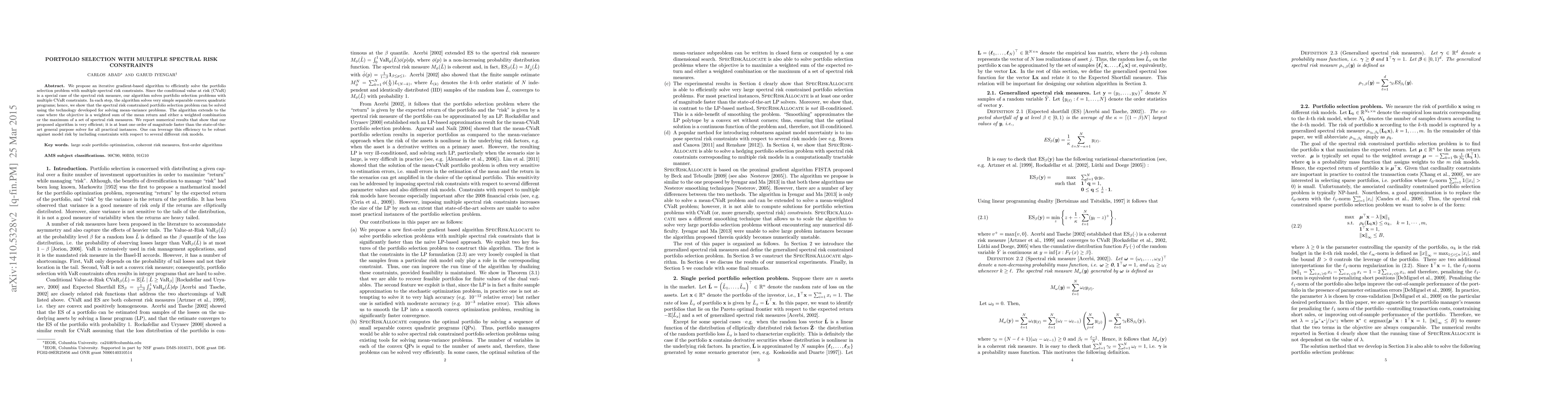 This paper proposes an efficient gradient-based algorithm for portfolio selection with multiple spectral risk constraints, specifically addressing conditional value at risk (CVaR). The algorithm iteratively solves simple convex quadratic programs and extends to weighted combinations of mean return and various spectral risk measures, proving significantly faster than existing solvers.