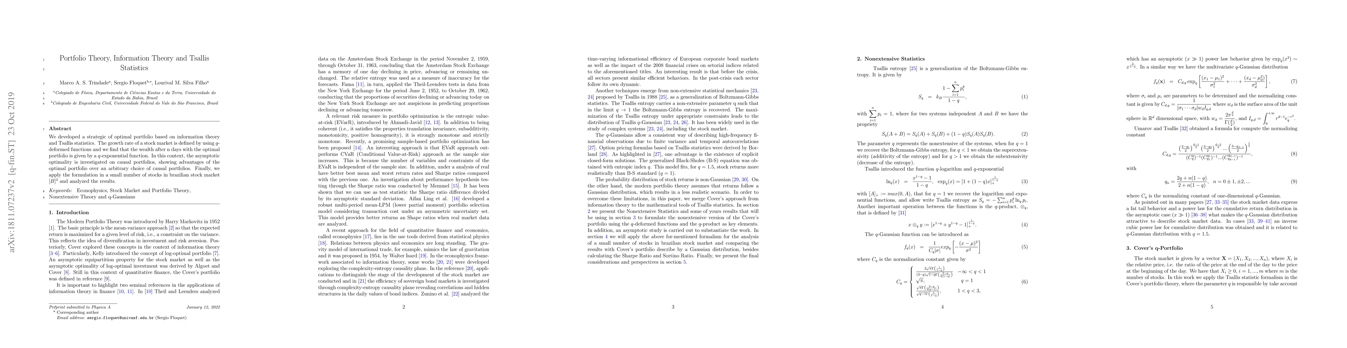 We developed a strategic of optimal portfolio based on information theory and Tsallis statistics. The growth rate of a stock market is defined by using $q$-deformed functions and we find that the wealth after n days with the optimal portfolio is given by a $q$-exponential function. In this context, the asymptotic optimality is investigated on causal portfolios, showing advantages of the optimal portfolio over an arbitrary choice of causal portfolios. Finally, we apply the formulation in a small number of stocks in brazilian stock market $[B]^{3}$ and analyzed the results.