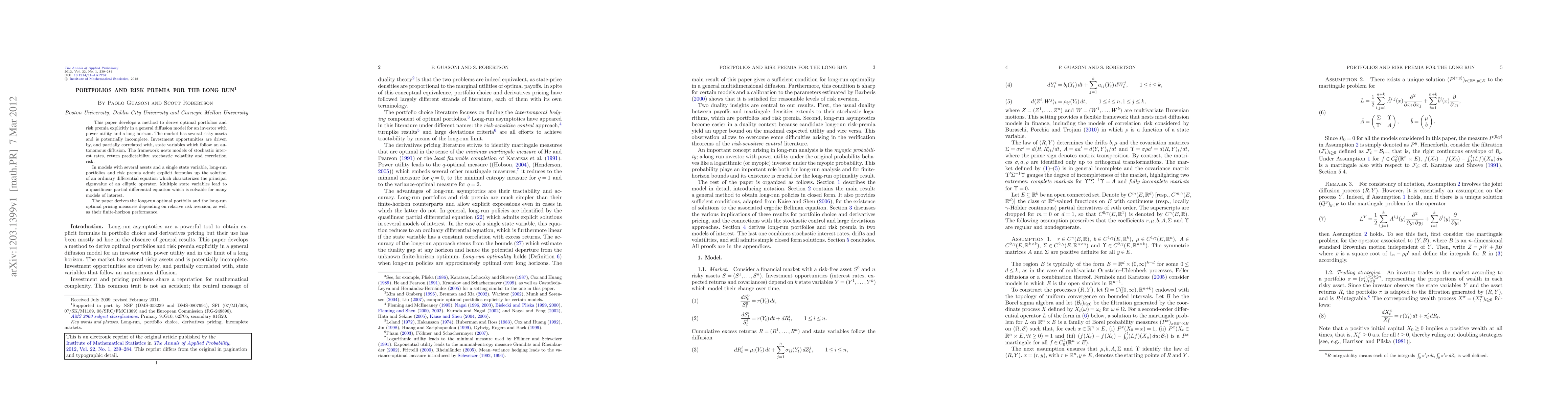 This paper develops a method to derive optimal portfolios and risk premia in a general diffusion model for long-horizon investors with power utility, providing explicit formulas for multiple risky assets and state variables. It solves a quasilinear partial differential equation to determine long-run optimal portfolios and pricing measures.