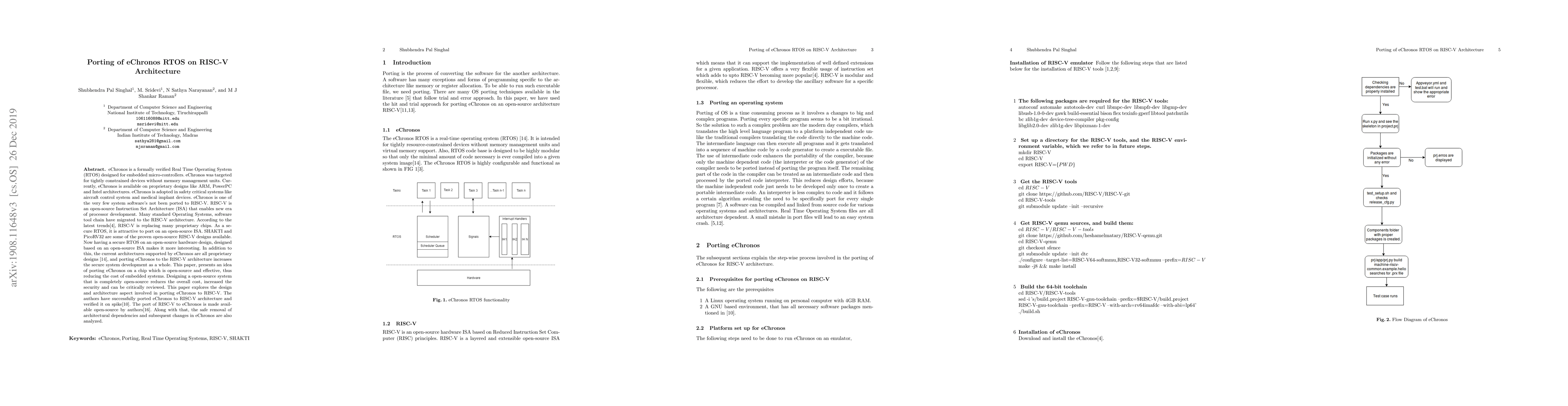 This paper details the porting of the formally verified eChronos RTOS to the open-source RISC-V architecture, showcasing its successful implementation and verification on the RISC-V simulator spike. The study emphasizes the benefits of securing system development through open-source hardware and software integration.