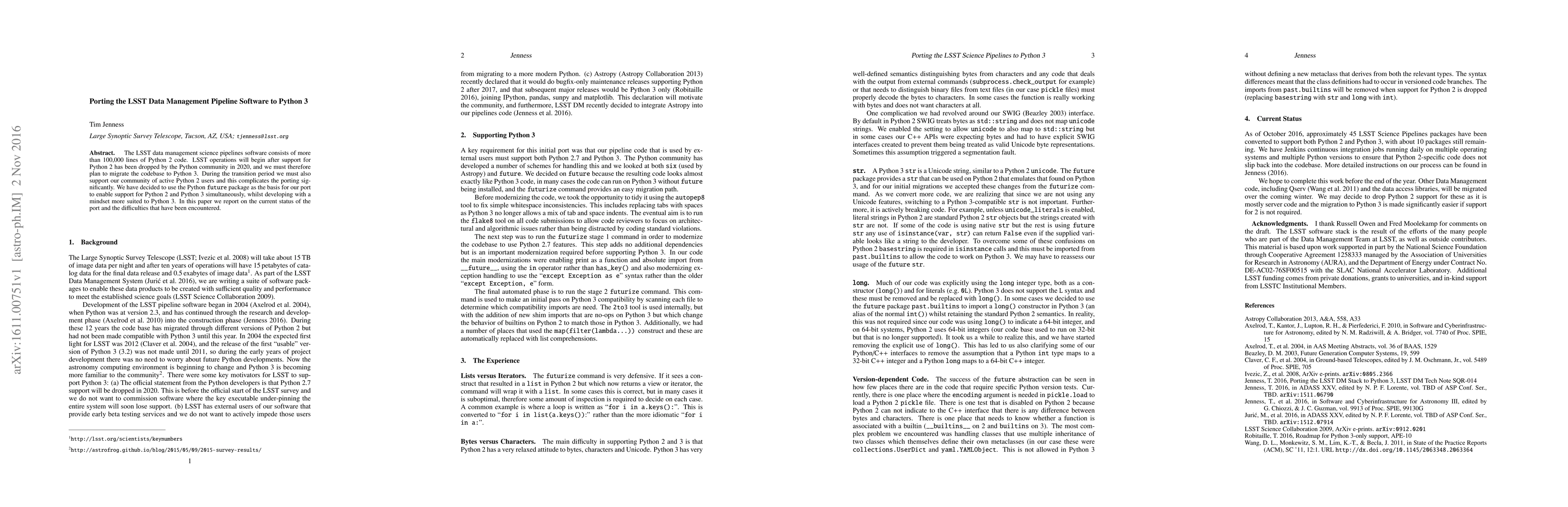 The LSST data management pipeline software is being ported to Python 3 with support for both Python 2 and Python 3 using the Python future package, addressing the challenges of migrating from Python 2.