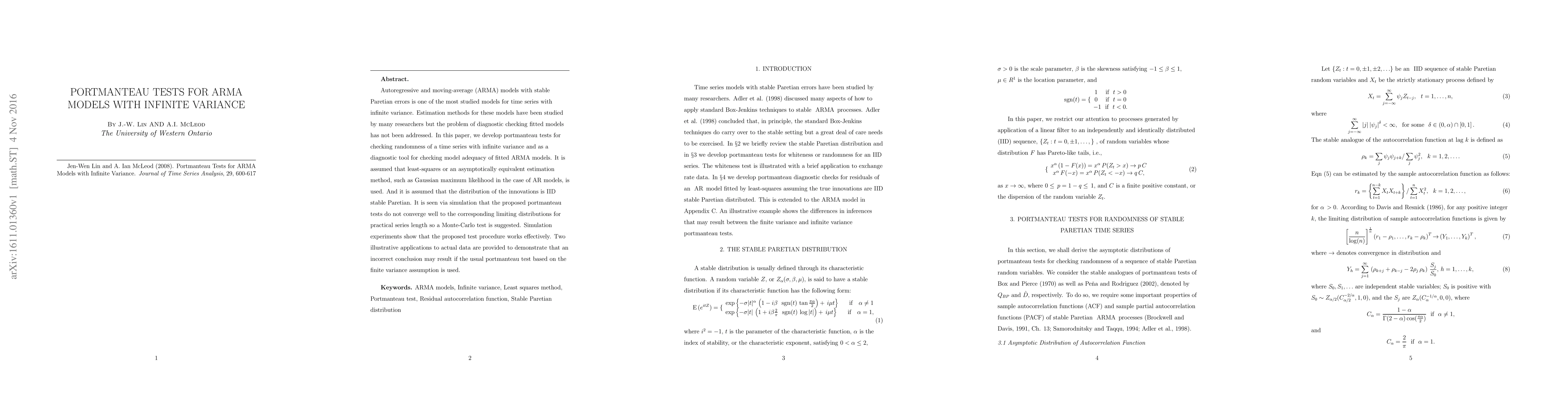This paper develops portmanteau tests for diagnosing the adequacy of ARMA models with stable Paretian errors, providing a Monte-Carlo approach due to poor convergence of the tests for practical series lengths. The proposed tests effectively identify model inadequacies, as demonstrated by applications to real data.
