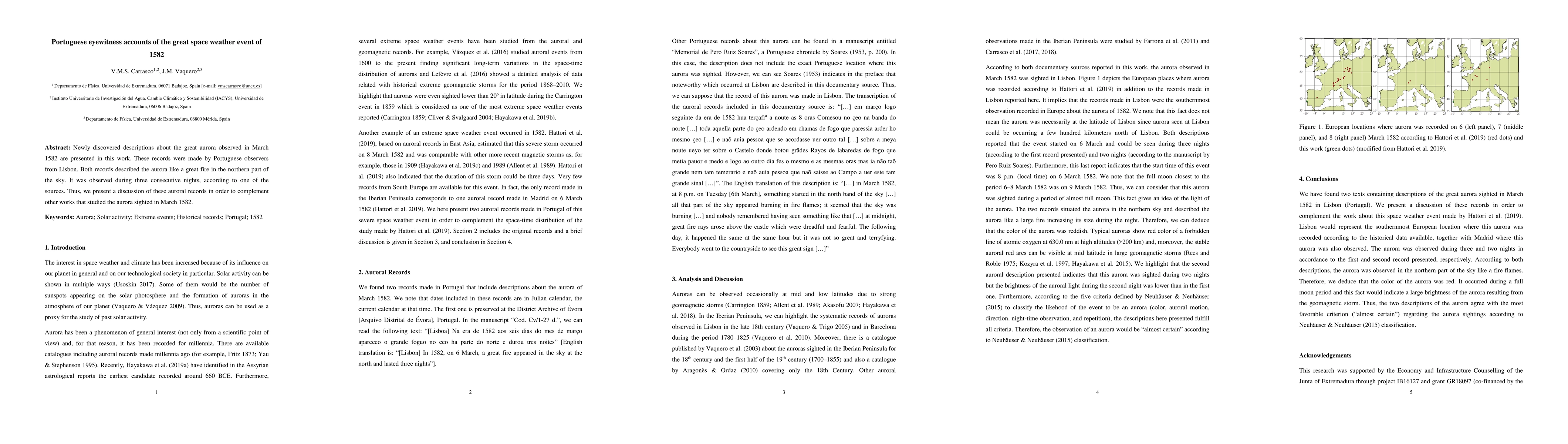 Newly discovered descriptions about the great aurora observed in March 1582 are presented in this work. These records were made by Portuguese observers from Lisbon. Both records described the aurora like a great fire in the northern part of the sky. It was observed during three consecutive nights, according to one of the sources. Thus, we present a discussion of these auroral records in order to complement other works that studied the aurora sighted in March 1582.