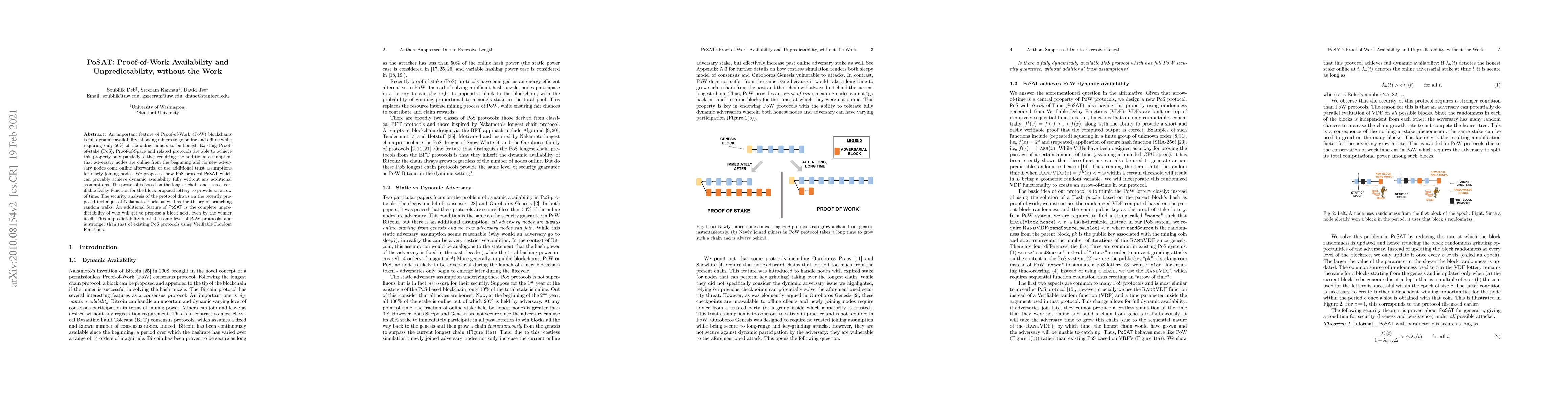 A new Proof-of-Stake (PoS) protocol called PoSAT achieves dynamic availability without additional assumptions, providing full proof of work availability and unpredictability, similar to traditional Proof-of-Work protocols.