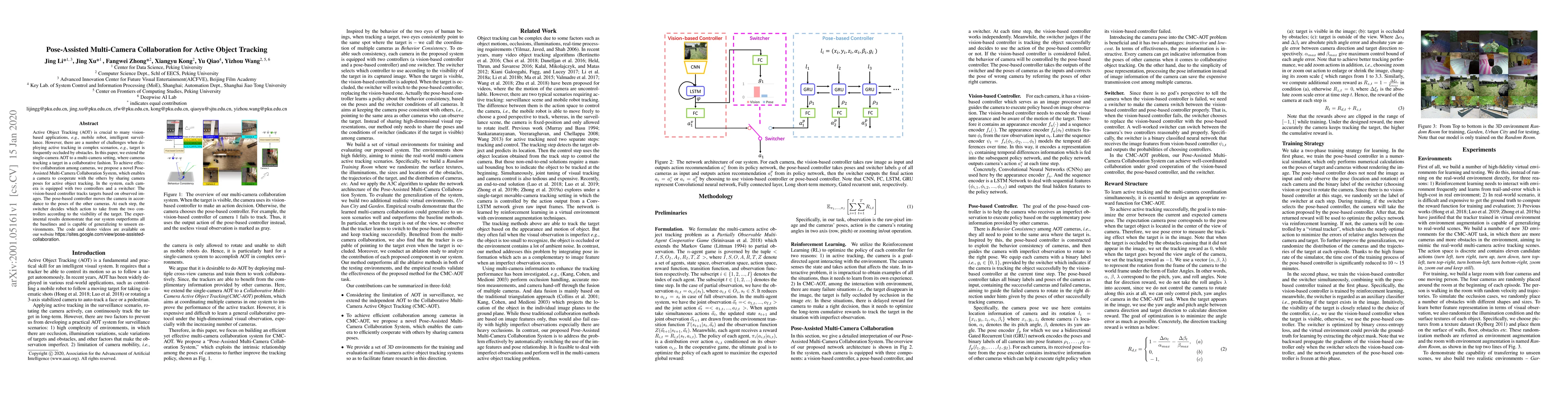 The paper proposes a Pose-Assisted Multi-Camera Collaboration System for Active Object Tracking (AOT), extending single-camera AOT to a multi-camera setting. Each camera has a vision-based controller for image processing, a pose-based controller for pose-guided rotation, and a switcher to decide which controller to use based on target visibility.