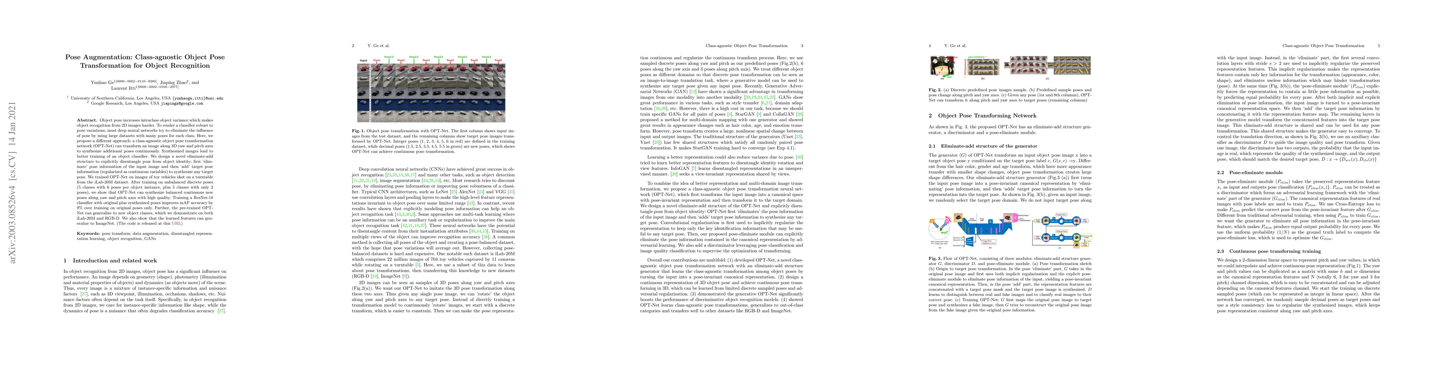 This paper proposes OPT-Net, a class-agnostic object pose transformation network that synthesizes additional object poses continuously by transforming images along 3D yaw and pitch axes. This approach improves object recognition classifier training and achieves a 9% accuracy improvement over training on original poses alone.