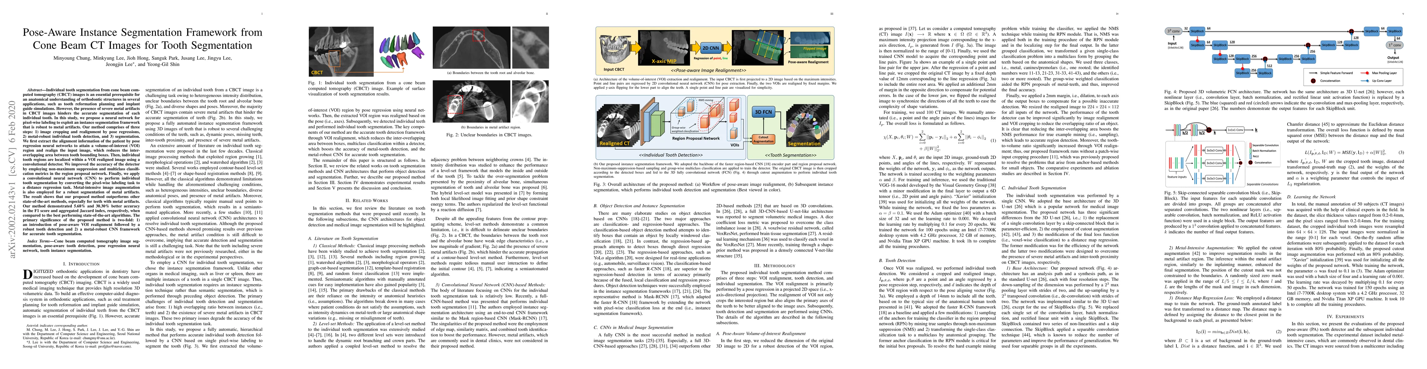 This paper proposes a neural network framework for accurate tooth segmentation from cone beam CT images, addressing the challenge of metal artifacts. The method involves pose regression for image realignment, robust tooth detection, and a metal-robust convolutional neural network for segmentation, outperforming other state-of-the-art techniques.
