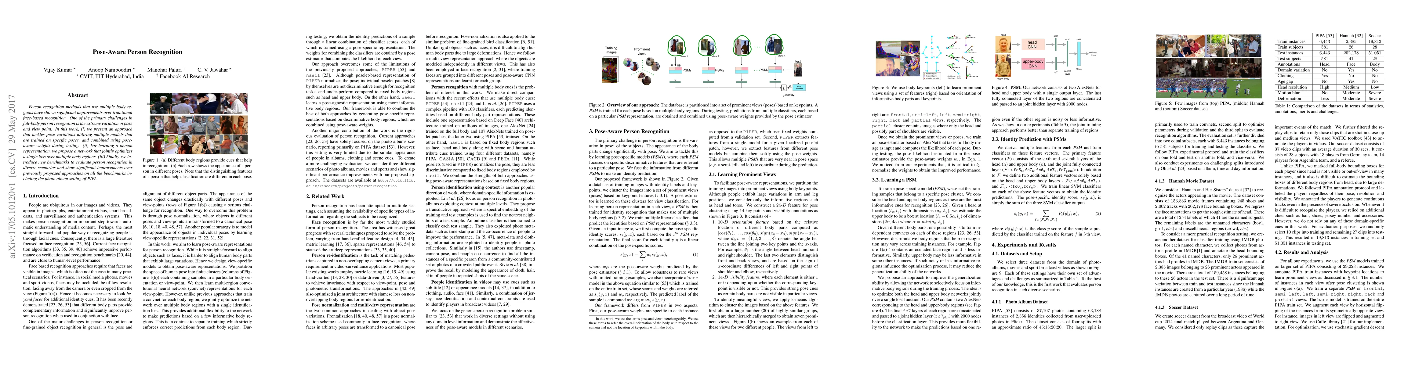 This paper presents an advanced pose-aware person recognition method that addresses extreme pose variations using multiple pose-specific models combined with pose-aware weights. It also introduces a network optimizing a single loss over multiple body regions and new benchmarks for diverse evaluation, demonstrating significant improvements over prior approaches.